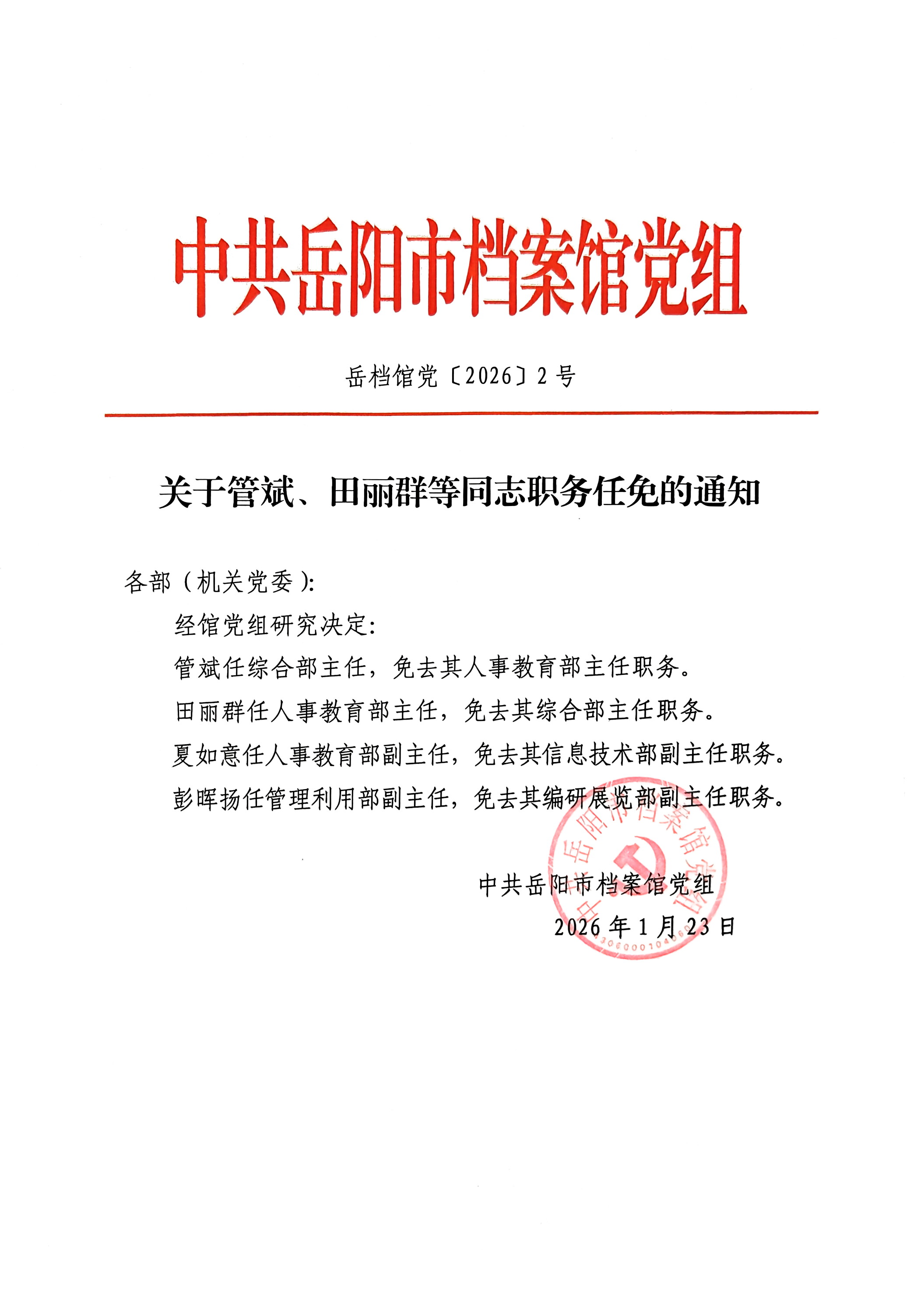 关于管斌、田丽群等同志职务任免的通知