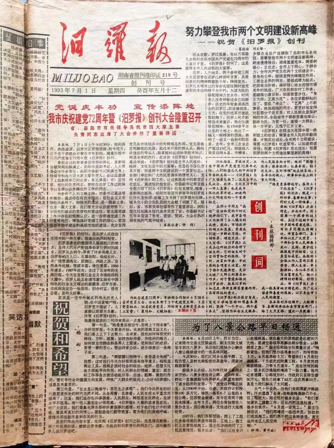1993年7月1日,《汨罗报》创刊号。