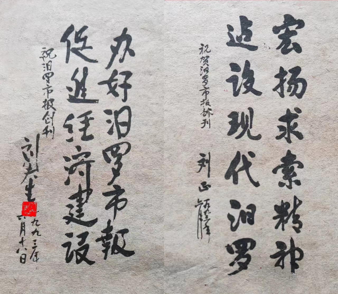 湖南省人大常委会主任刘夫生、湖南省政协主席刘正为《汨罗报》题词手迹。