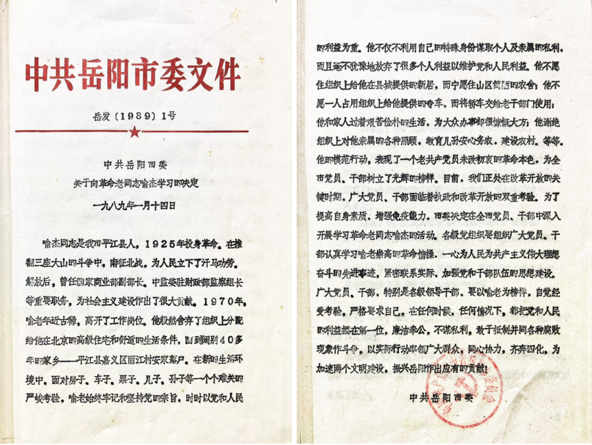 1989年,中共岳阳市委颁布的《关于向革命老同志喻杰学习的决定》文件