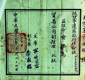 图为1945年陕甘宁边区政府任命喻杰为贸易公司副经理的任命状