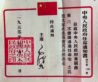 图为1950年中央人民政府任命喻杰为西北军政委员会贸易部部长的任命书