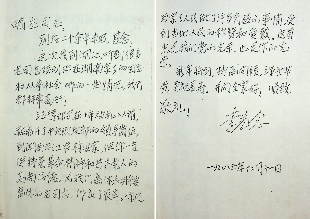 图为原国家主席李先念在1985年12月11日写给喻杰的信(李先念曾亲笔致信喻杰,称他为“老干部的楷模”)