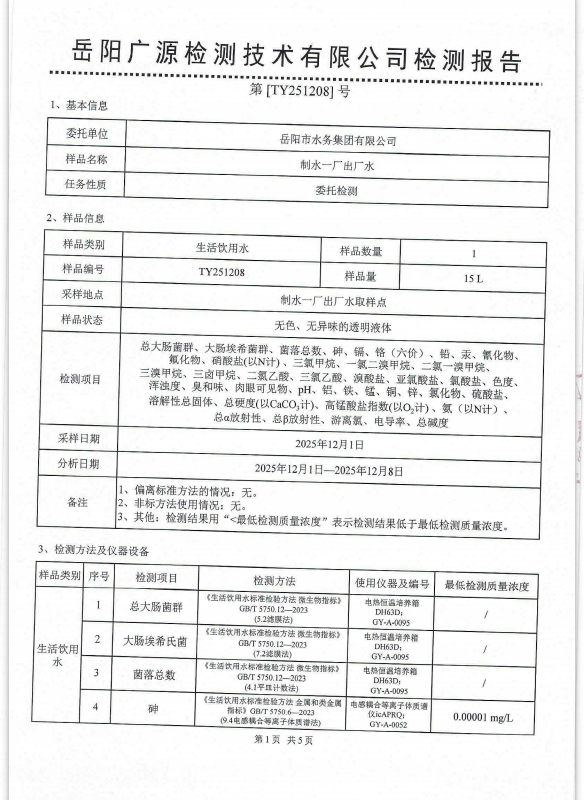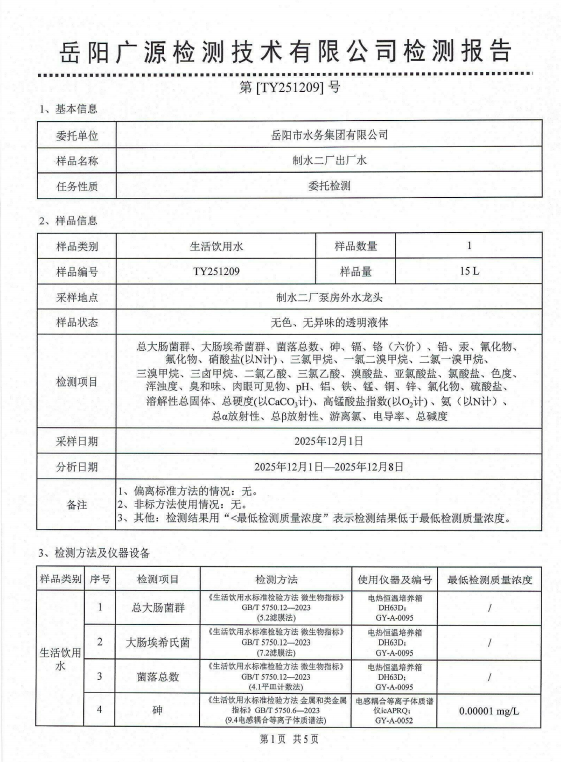 2025年12月岳阳市水务集团出厂水水质检测月报表