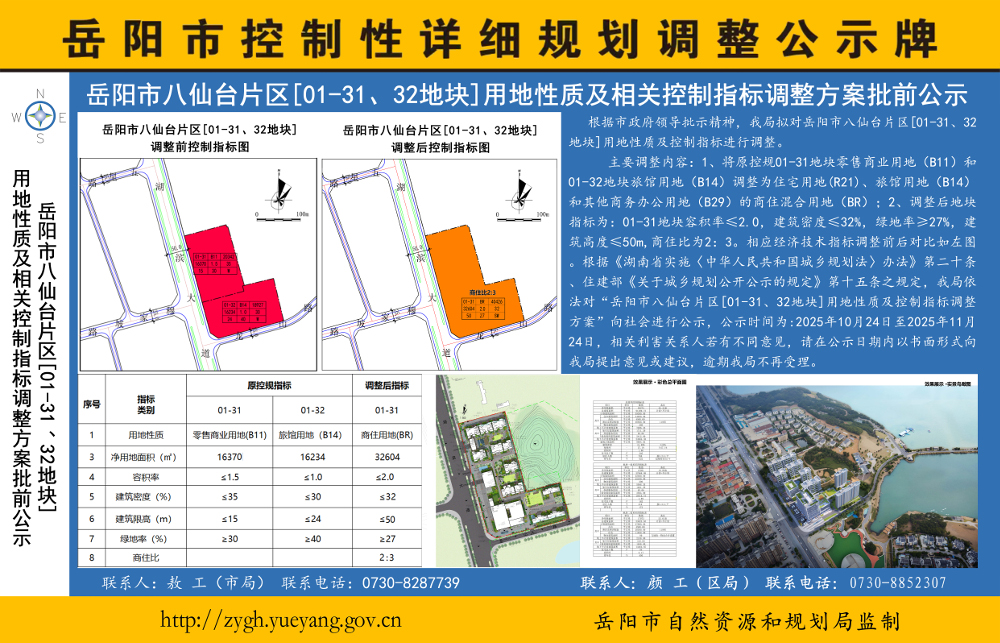 岳阳市八仙台片区【01-31、32地块】用地性质及相关控制指标调整方案批前公示