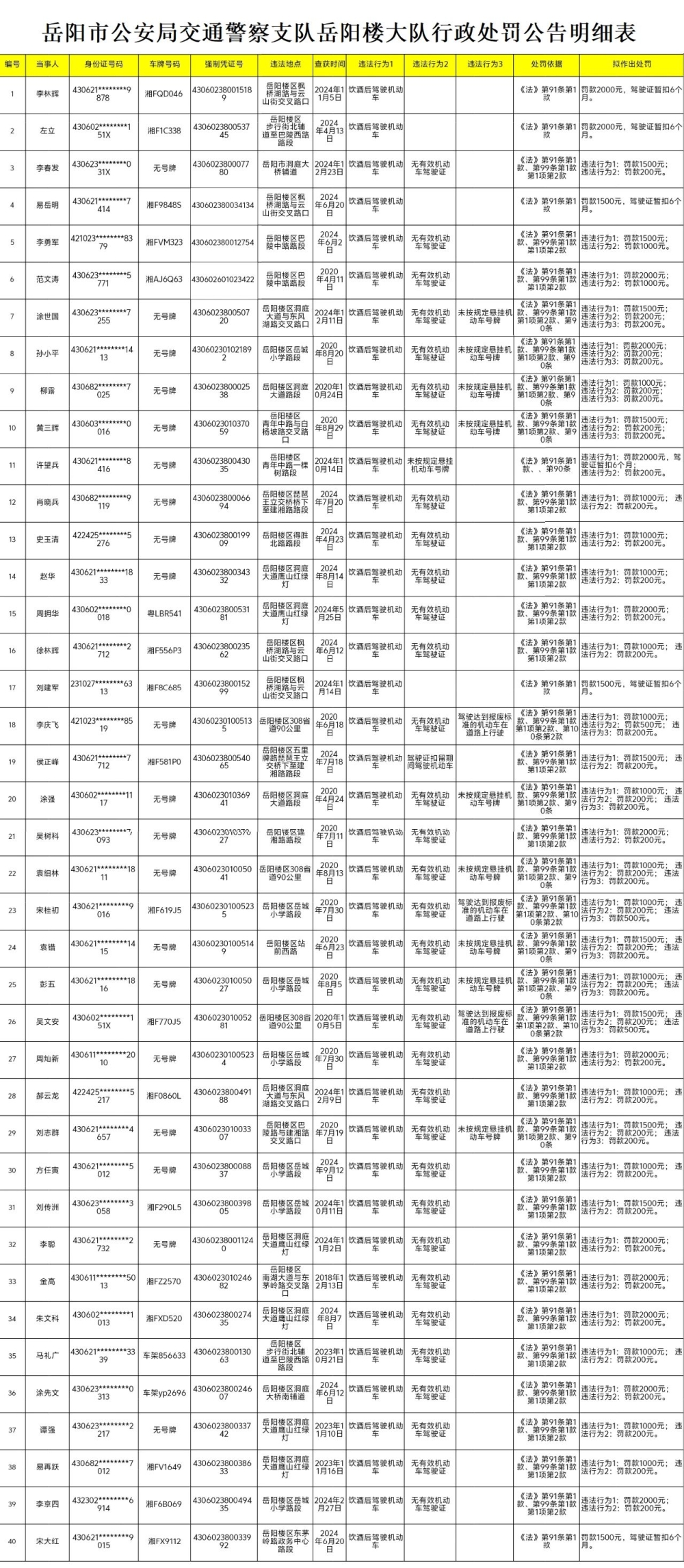 岳阳市公安局交通警察支队岳阳楼大队公安交通管理行政处罚告知公告