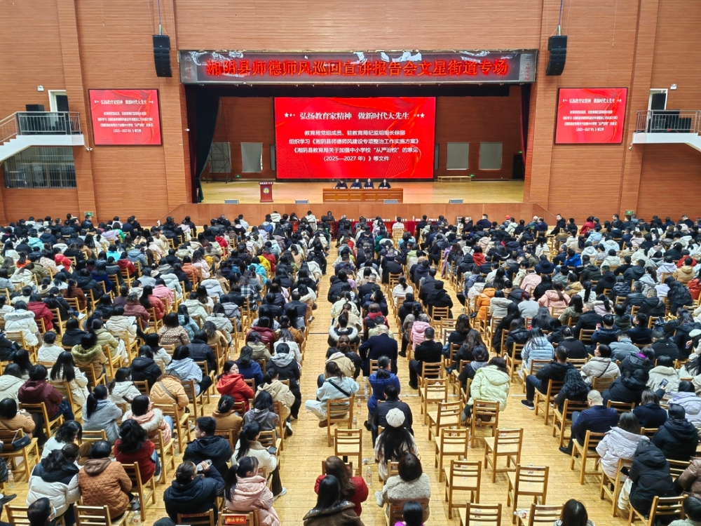 在文星街道专场报告会现场,湘阴县教育局负责人解读了《湘阴县师德师风建设专项整治工作实施方案》《湘阴县教育局关于加强中小学校“从严治校”的意见(2025—2027 年)》《湘阴县教育局关于全面提升普通高中教学质量的意见》等。知源学校肖青青、车马学校陈旭彦等四名宣讲员分别结合自身的从教经历,用朴素的语言讲述了他们不忘教育初心、牢记育人使命,立根三尺讲台、甘于默默奉献、挥洒青春汗水的真实感人故事。