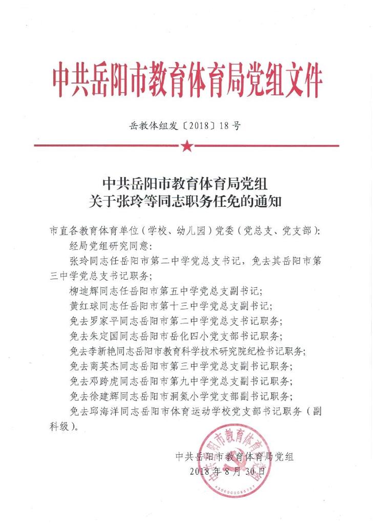 中共岳阳市教育体育局党组关于张玲等同志职务任免的通知(岳教体组发[2018]18号)