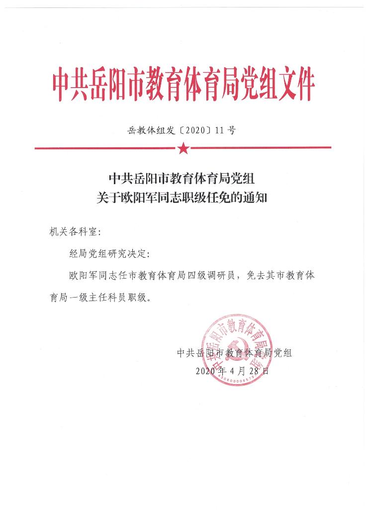 中共岳阳市教育体育局党组关于欧阳军同志职级任免的通知