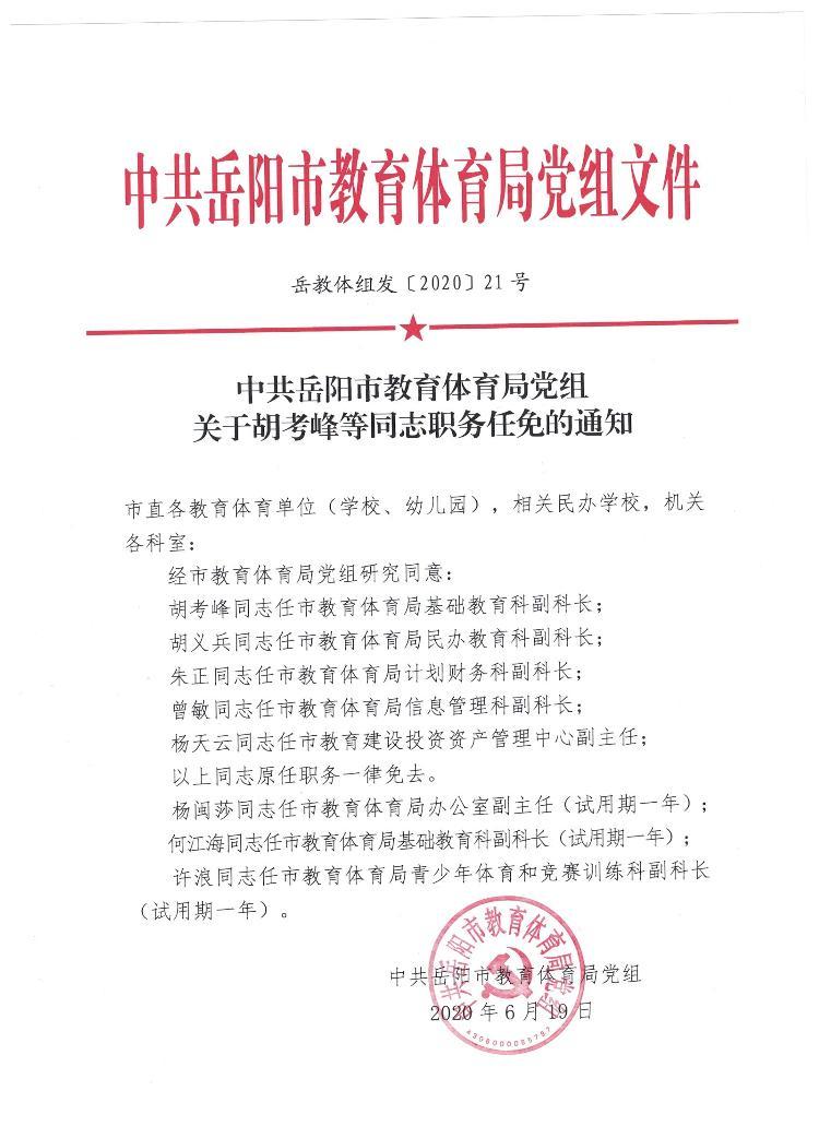 中共岳阳市教育体育局党组关于胡考峰等同志职务任免的通知