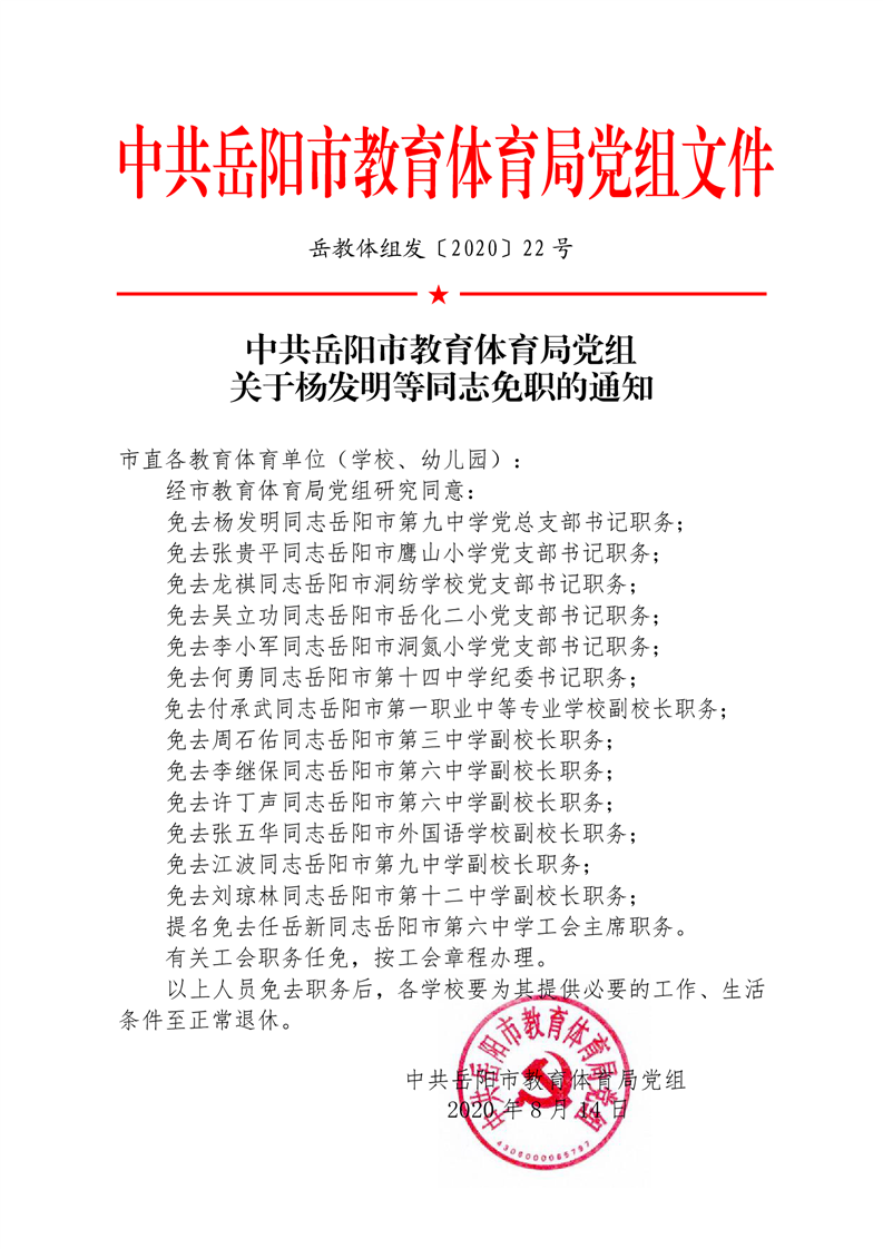 中共岳阳市教育体育局党组关于杨发明等同志免职的通知