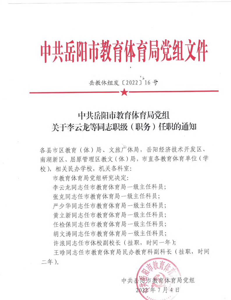 中共岳阳市教育体育局党组关于李云龙等同志职级(职务)任职的通知