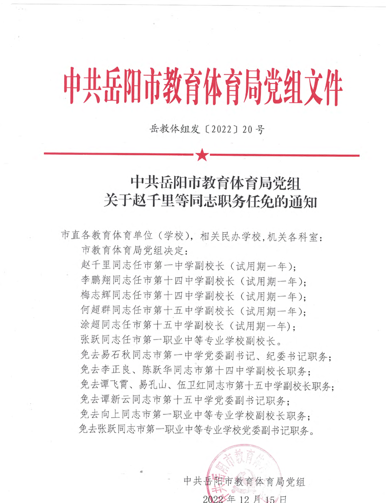 中共岳阳市教育体育局党组关于赵千里等同志职务任免的通知