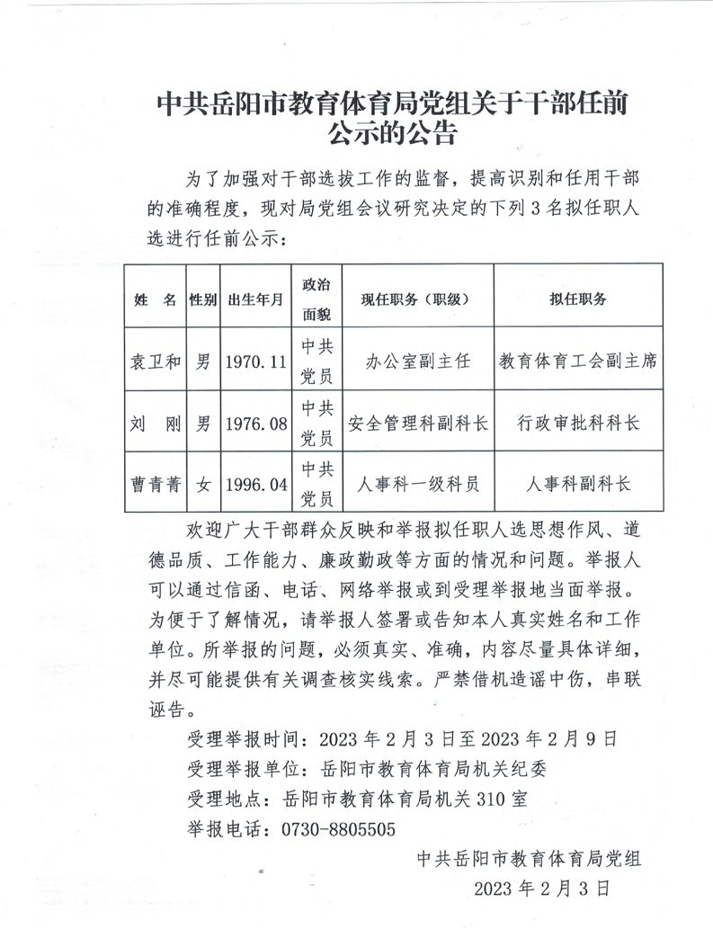 中共岳阳市教育体育局党组 关于干部任前公示的公告
