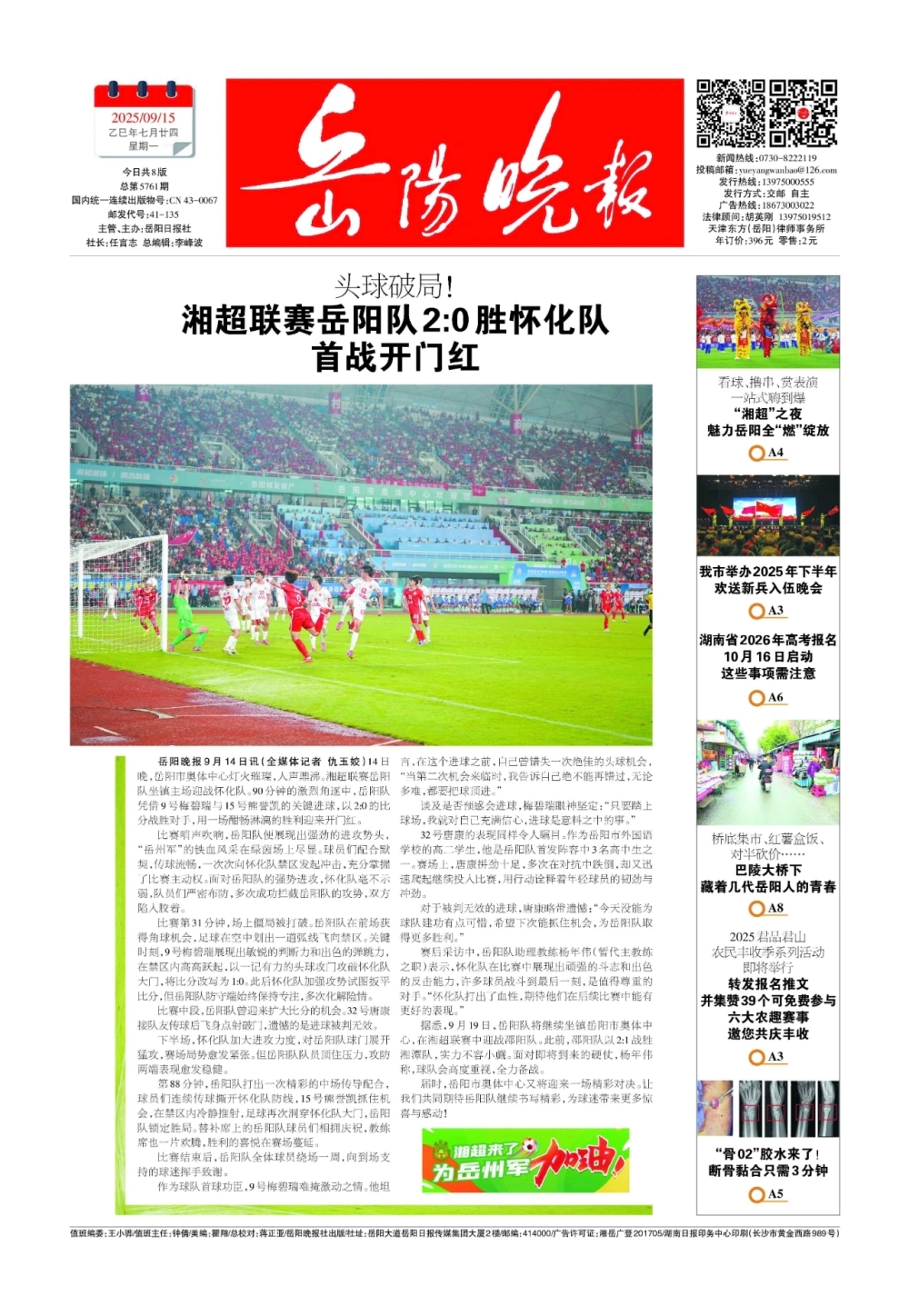 14日晚,岳阳市奥体中心灯火璀璨,人声鼎沸。湘超联赛岳阳队坐镇主场迎战怀化队。90分钟的激烈角逐中,岳阳队凭借9号梅碧瑞与15号熊誉凯的关键进球,以2:0的比分战胜对手,用一场酣畅淋漓的胜利迎来开门红。