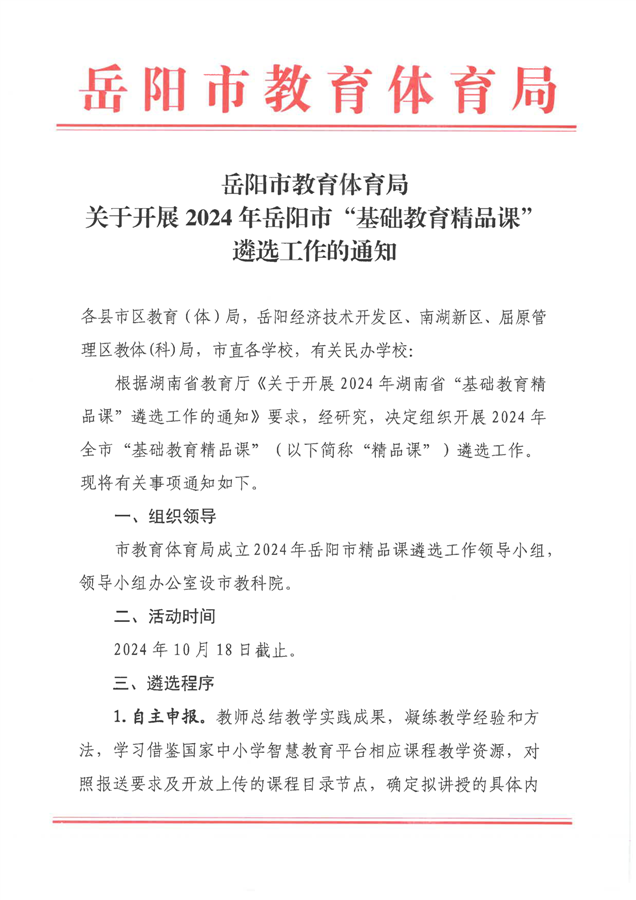 关于开展2024年岳阳市“基础教育精品课”遴选工作的通知