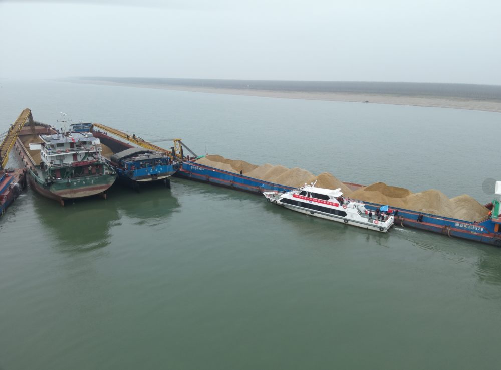 联合巡江队伍乘坐岳阳水政06公务船执法船从岳阳海事码头出发,经三江口前往长江云溪段水域开展巡查,重点检查河道管理范围内是否存在非法采砂、侵占河道、违法建设等涉河违法行为。在百盛锚地,巡江队伍现场检查了运砂船采运管理单、砂石过驳及过驳证明开具等情况,并通过发放宣传手册、现场解读等形式,向管理服务对象普及长江保护相关法律法规,提升社会公众对《中华人民共和国长江保护法》的知晓度、参与率和认同感,营造了守护长江母亲河、共建美丽幸福河湖的良好法治氛围。
