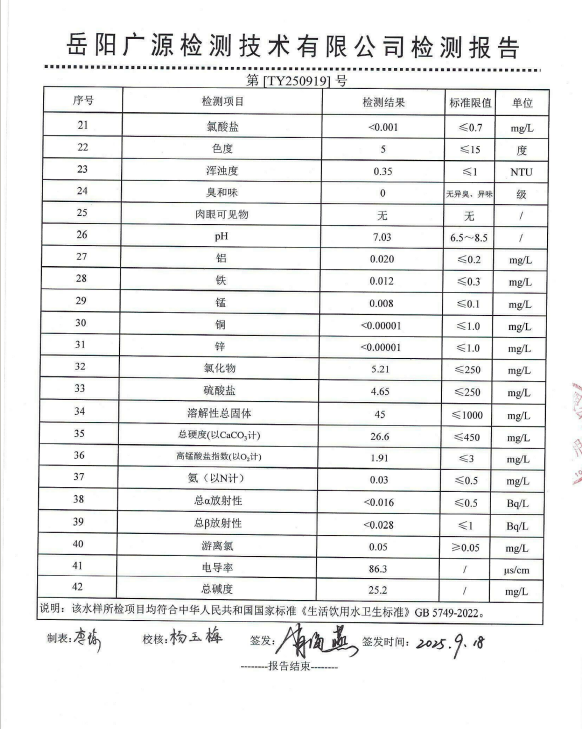 2025年9月岳阳市水务集团管网水水质检测月报表
