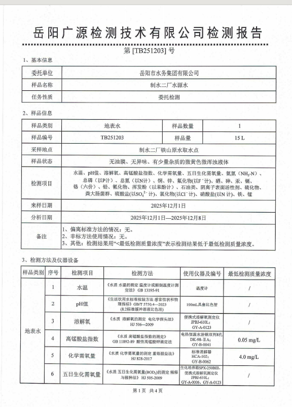 2025年12月岳阳市水务集团水源水水质检测月报表
