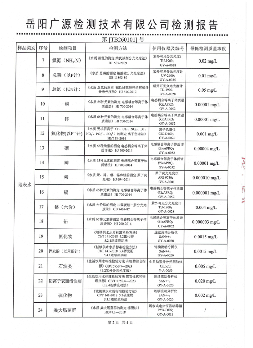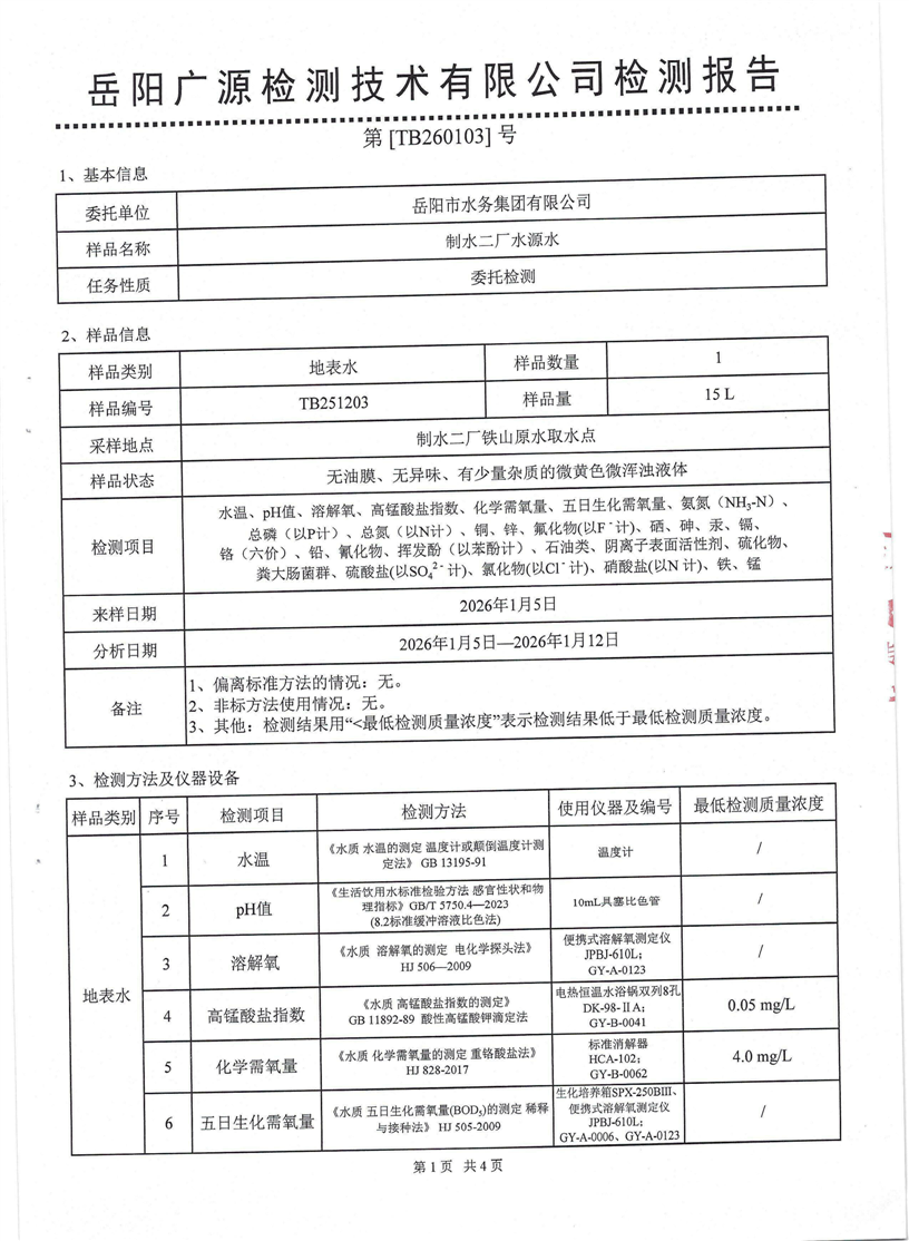 2026年1月岳阳市水务集团水源水水质检测月报表