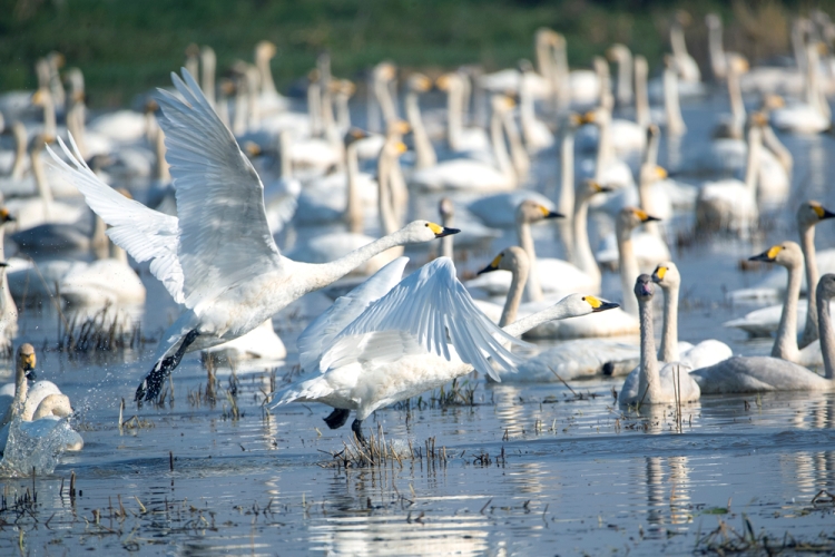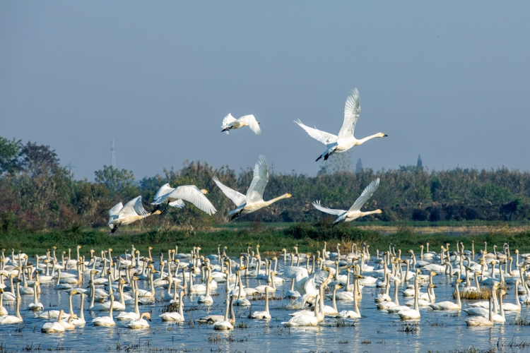 时值初冬,正是候鸟迁徙洞庭湖湿地之季。日前,在屈原管理区的古湖湿地,迎来了3000多只天鹅栖息越冬。连日来,这些天外来客让寂静的古湖变得热闹起来,引来无数人前来观赏。古湖湿地,位于屈原管理区域北岸,与湘江和汨罗江相邻,北靠洞庭湖,总面积达700亩。这里草肥叶茂,水源充足,田间河畔垂柳依依,湖边芦苇竞相摇曳, 良好的自然生态适合珍禽繁衍生息。近年来,屈原管理区坚持“生态优先、保护第一”的理念和“保护优先、科学修复、合理利用、持续发展”的原则,先后实施退耕还林、退耕还湿、渠系疏浚、自然修复等工程,多措并举开展被损小微湿地修复,大力提升全民生态保护意识,为鸟类迁徙、繁殖期提供栖息生境。这样优厚的自然环境无疑给远方来客天鹅们提供了一个天然的生息场所。据营田镇荷花村村民龙勇介绍,这些天鹅已经来了一个多星期了,每天早上7点左右它们从湖中飞来这里觅食,成批结队飞落在田间、池塘里,起舞欢歌,好不热闹。傍晚时分它们又成群结队地从这里飞向湖的远处。龙勇说他在这里生活了近40年,像这样上千数量的天鹅群飞来古湖栖息,还是第一次见到。该区林业站站长陈云辉向记者介绍,近几年,屈原管理区重视自然资源保护和湿地环境的改善,为保护好前来越冬的天鹅,该区林业、农业、公安、法院、检察等部门已联合成立了专项小组,在天鹅栖息地附近做好了警示牌,每天24小时派人巡逻,清点天鹅数量,做好登记工作。