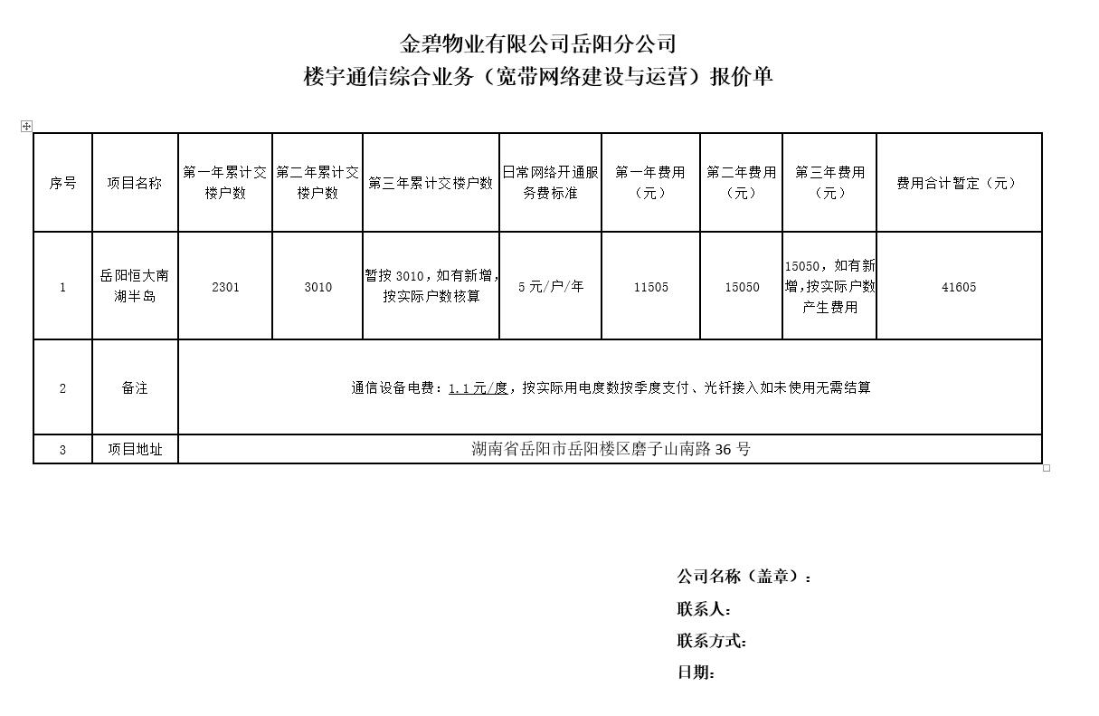 | 内容: | 尊敬的市长: 您好! 我是南湖半岛的业主,2017年底交房后,小区手机信号差,室内(包括电梯、房间、公共走廊)信号差,打电话经常断线,因此邻居们向各个运营商客户电话咨询反馈信号差的问题。 近日我跟南湖半岛邻居聊天得知,移动计划投资几百万在小区建设基站,解决信号覆盖的问题(其它运营商情况不清楚),但是由于物业要收取1万每年的入场服务费,一直为谈妥,因此信号覆盖问题一直为能解决。另外物业对运营商收取每户5-6元的服务费,先交钱的先入场,没交钱的无法进场安装,现在是市场经济,业主有权选择自己喜欢的运营商安装宽带和电视,请市长大人为民做主,督促相关部门解决各运营商在南湖半岛小区手机信号覆盖问题和自由选择宽带运营商等安装接入问题,感谢! 附:金碧物业有限公司岳阳分公司楼宇通信综合业务(宽带网络建设与运营)报价单 |