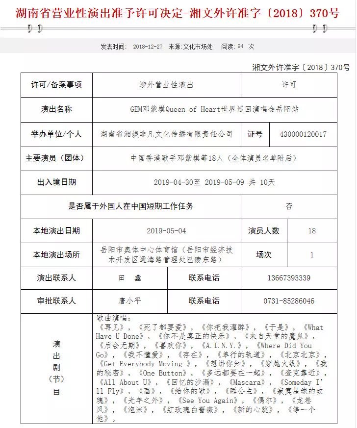 | 回复内容: | 易涛先生: 您好!您来信咨询邓紫棋演唱会,我局市场科告知:邓紫棋演唱会已经省厅审批,报经开区教育文体工作局备案,将于2019年5月4日在(新)市体育馆举行。 岳阳市文化旅游广电局 2019年2月12日 |