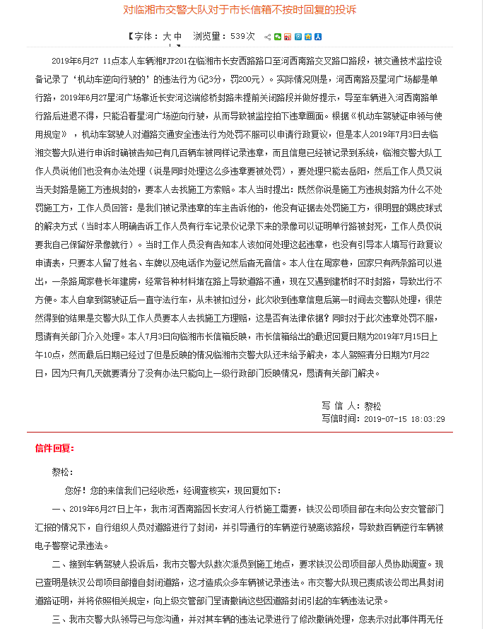 2、交警队的一线业务人员水平有待加强,写信人明确提出有证据,且有几百人的同样的情况为何还不作出回应?说明对群众的事情根本不上心,写了市长信箱后马上有效果说明对领导的事情较为上心。作为一个临湘人感到无比的无比的没话说。