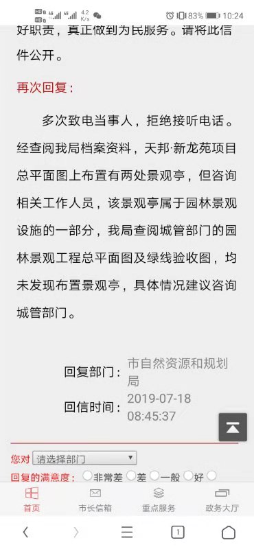 | 回复内容: | 方郑先生: 您好!您的来信《天龙新龙苑园林亭子问题》收悉。现将有关情况说明如下: 一、项目基本情况 经工作人员核实,“天邦新龙苑”由岳阳市天邦房地产开发有限公司开发建设。该项目净用地面积为24227.4平方米,该项目标准绿地率为35%,标准绿地面积为8479.59平方米。项目于2017年3月在原岳阳市风景园林局办理绿线划定手续。项目于2019年5月在我局办理了绿线验收手续,绿线验收绿地率为38.51%,验收绿地面积为9330.48平方米,绿线验收指标满足规范要求。 二、景亭相关情况 项目附属绿化工程建设时在不违反规范强制标准的情况下可以进行优化调整,您反映的小区园林景亭问题不属于规范强制标准范畴,开发商可自行优化调整。 感谢您对我局园林绿化工作的关心和监督,欢迎多提宝贵意见! 岳阳市城市管理和综合执法局 2019年8月15日 |