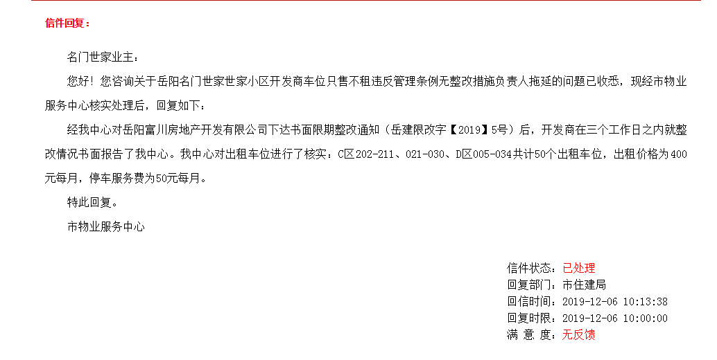 | 内容: | 您好 我是岳阳市名门世家小区业主,我余8月份写了一封市长信箱反映“岳阳市名门世家小区车位只售不租问题”,当时住建部门回信:已行政约谈岳阳富川房地产开发有限公司负责人,要求在本月底前按照《湖南省物业管理条例》第五十条规定实行“租售同步”整改,如未整改,将依法进行行政处罚。10月份市住建局市物业管理公司回复整改:“我中心现已对岳阳富川房地产开发有限公司下达书面限期整改通知(岳建限改字【2019】5号),在该“通知”中已明确,必须按照《湖南省物业管理条例》第五十条规定实行“租售同步”整改。并在三个工作日之内就整改情况书面报告我局。对拒不整改或经督促仍然未整改到位的,我局将依法立案查处,并将该公司违规行为纳入不良信用记录。” 11底继续投诉开发商故意拖延出租车位,后得到相关部门回复“经我中心对岳阳富川房地产开发有限公司下达书面限期整改通知(岳建限改字【2019】5号)后,开发商在三个工作日之内就整改情况书面报告了我中心。我中心对出租车位进行了核实:C区202-211、021-030、D区005-034共计50个出租车位,出租价格为400元每月,停车服务费为50元每月。” 在小区一千多住户,在大量车位闲置的情况下,仅仅只开放50个车位出租,开发商专处罚管理空子,枉顾小区实际情况,糊弄业主,面对处理打折扣,请问开发商整改是否到位,还是只是简单应付检查而为之,请问业主权利如何维护。请相关部门认真维护业主权利,落实承诺,保障市民权益,而不是被开发商糊弄,专空子。 |