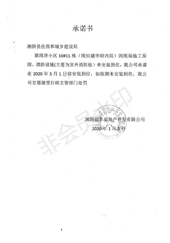 | 再次回复: | 你好,来信收悉,现回复如下: 恒盛华府项目10#、11#(原荷泽小区10#、11#栋)项目为县消防大队消防设计备案项目,2019年4月1日消防验收备案划转至我局,我局收到该信件后,立即派出工作人员多次到达恒盛华府项目10#、11#(原荷泽小区10#、11#栋)现场查勘情况,赶至我局城建档案馆调取竣工备案资料和消防大队了解设计图纸备案情况。综合处理意见如下:湘阴银丰房地产开发有限公司因恒盛华府项目正在施工中,其消防设施尚未完善、小区消防设施设备缺失后,该房地产公司当即作出承诺将于2020年3月1日前完成整改(见承诺书)。整改措施包括1、消防通道确保畅通;2、室外消火栓及灭火器按设计图纸安装到位。同时,我局也将继续关注该情况,督促银丰房地产开发公司将消防设施设备按时按要求整改到位。 (附银丰房地产开发公司承诺书)