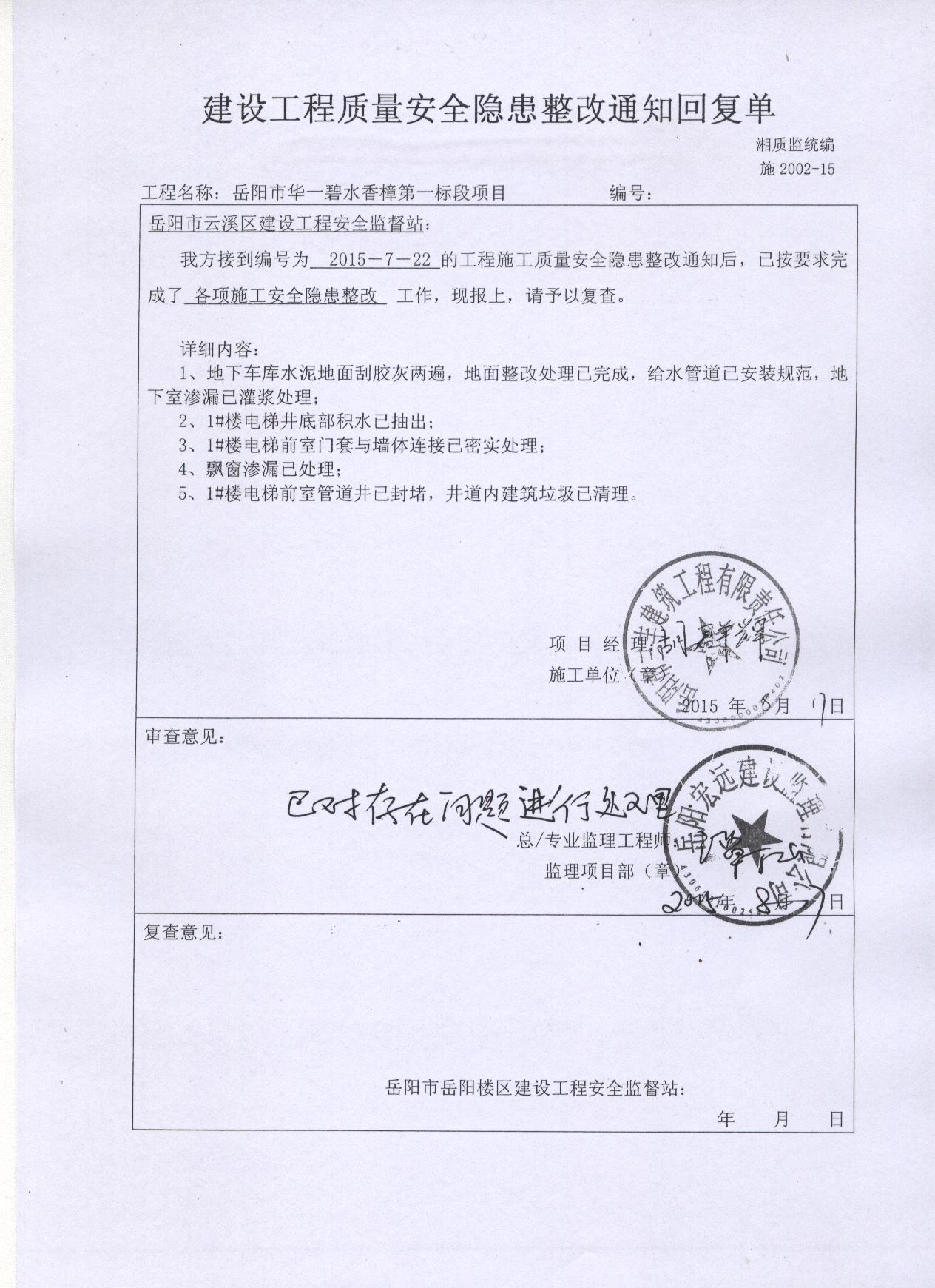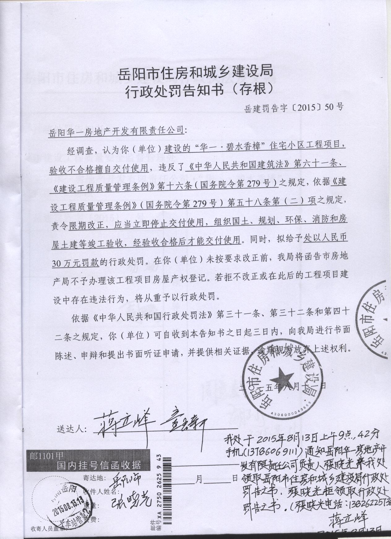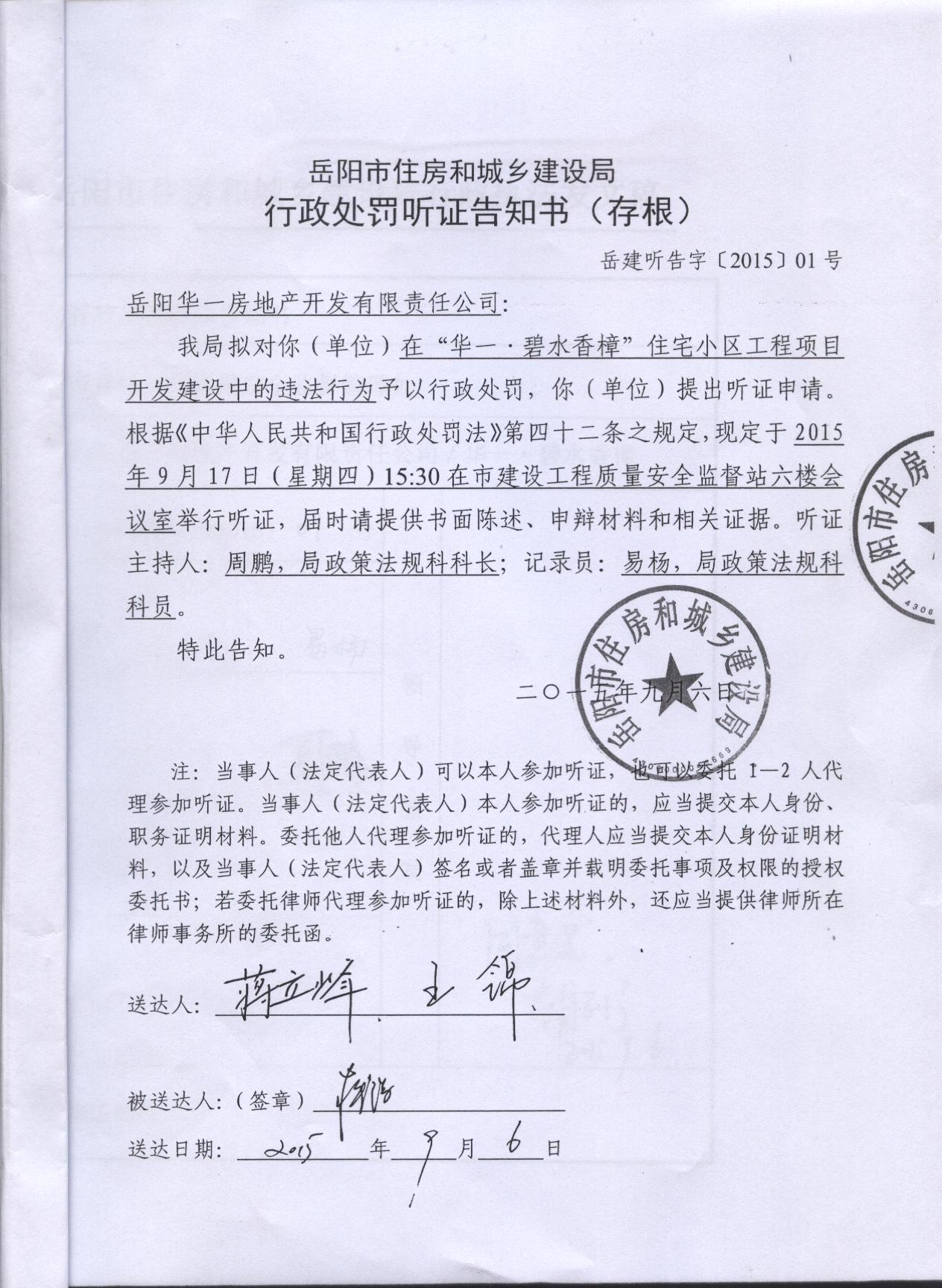 再次回复: | 碧水香樟业主: 1、关于2#楼东单元首层电梯前室进深仅 2、关于该工程未经竣工验收擅自交付使用的问题,我局对建设单位下发了《行政处罚告知书》,建设单位拒领该告知书,提出听证申请,按照程序,我局下发了《行政处罚听证告知书》,目前处于听证阶段。 3、关于电梯经常故障的问题,该电梯使用之前已经岳阳市质量技术监督局特种设备安全监察科检测合格并下发了《电梯使用标志》,不属我局职能范围,建议《市长信箱》转市质监局处理回复。 附件一:华一碧水香樟1#、2#楼工程质量问题整改资料 附件二:行政处罚告知书 附件三:行政处罚听证告知书 特此回复。 岳阳市住房和城乡建设局 2015年9月15日