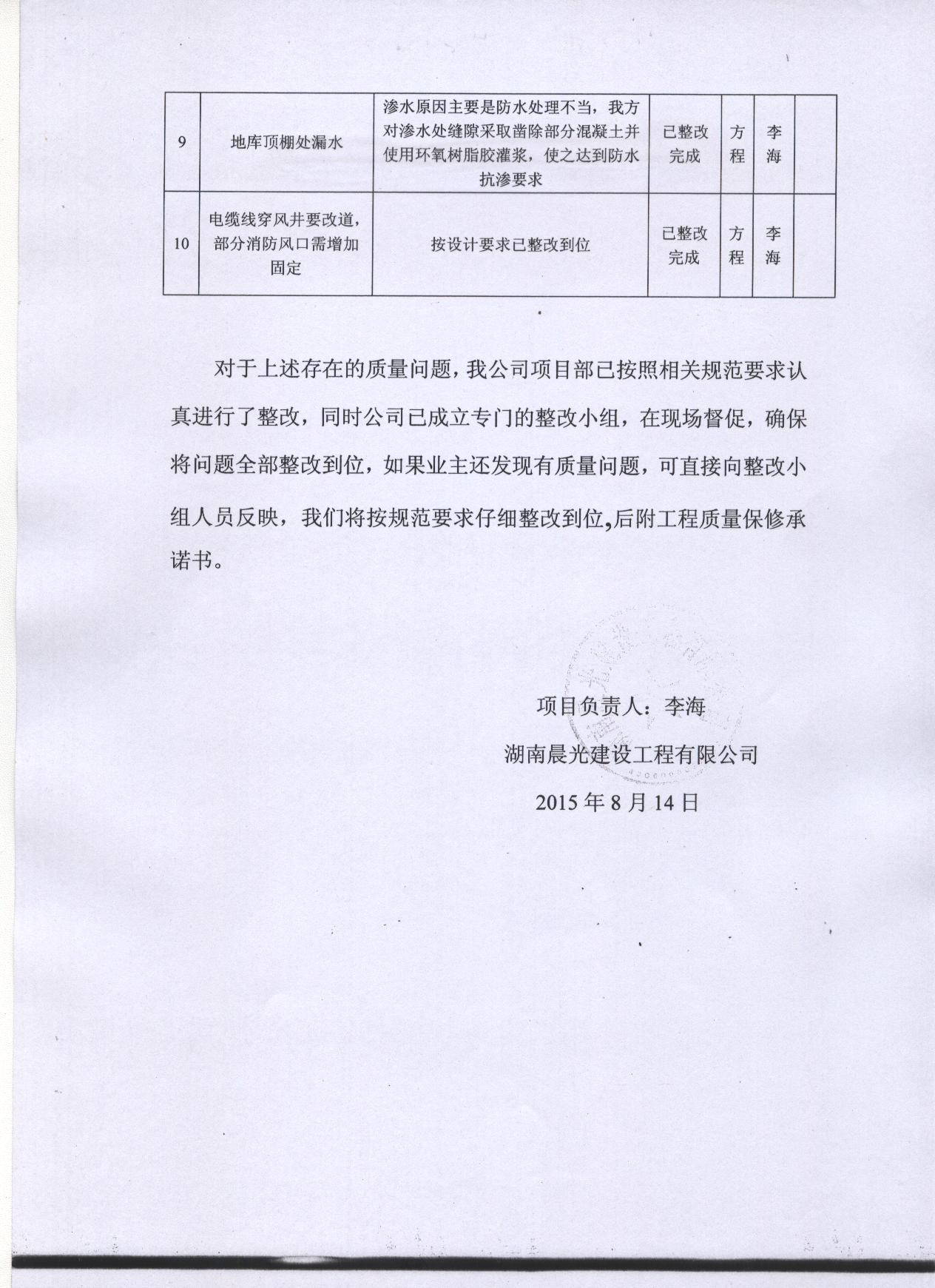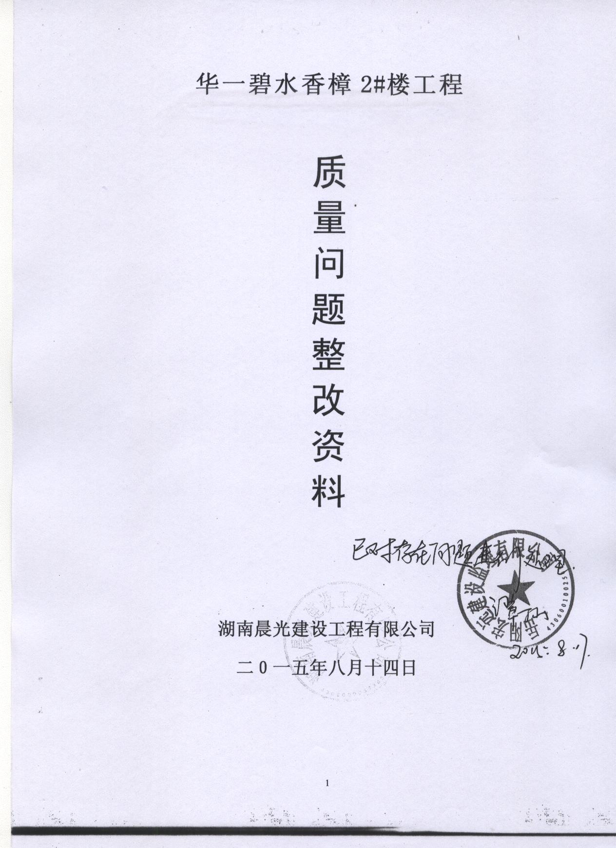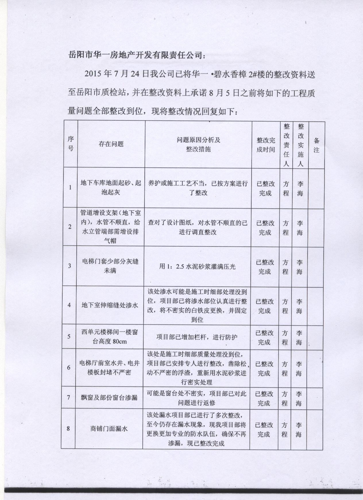 回复内容: | 碧水香樟业主: 您的来信收悉,现回复如下: 一、基本情况:华一碧水香樟1#、2#楼位于岳阳市洞纺生活区内,两栋均为地下1层,地上26层,建筑面积约 二、对质量问题的处理: 1、市质安处于 2、2#栋东单元首层电梯前室进深 3、关于“屋顶渗漏”及“架空层坑洼不平”问题已处理完毕。 4、对于总包单位施工范围内存在的质量缺陷,各责任主体单位均承诺只要发现就会立即整改到用户满意为止。 特此回复,若有相关疑问,请联系市建设工程质量安全监督处,地址:巴陵中路市住建局北院五楼。 岳阳市住房和城乡建设局 2015年5月25日 |