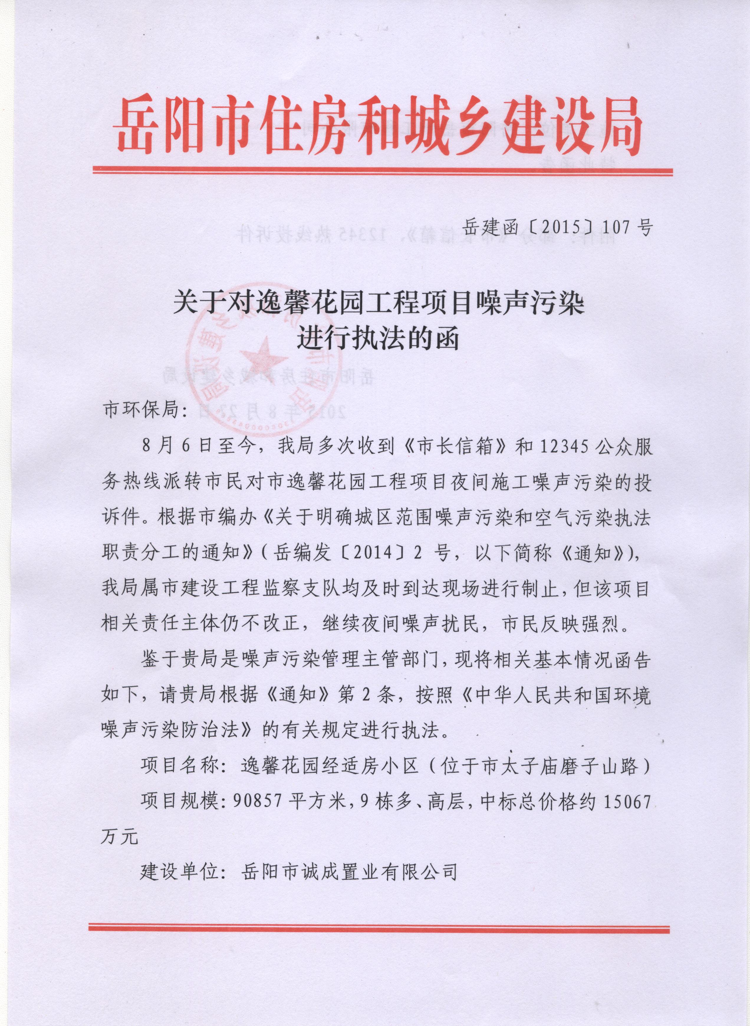 回复内容: | “嬷嬷小生”同志: 您好!关于逸馨花园项目噪声扰民的问题,我局根据市编办《关于明确城区范围噪声污染和空气污染执法职责分工的通知》(岳编办发[2014]2号)文件要求,向市环保局送达《关于对逸馨花园工程项目噪声污染进行执法的函》(岳建函[2015]107号),具体内容详见附件(扫描件)。 特此回复。 岳阳市住房和城乡建设局 2015年8月27日