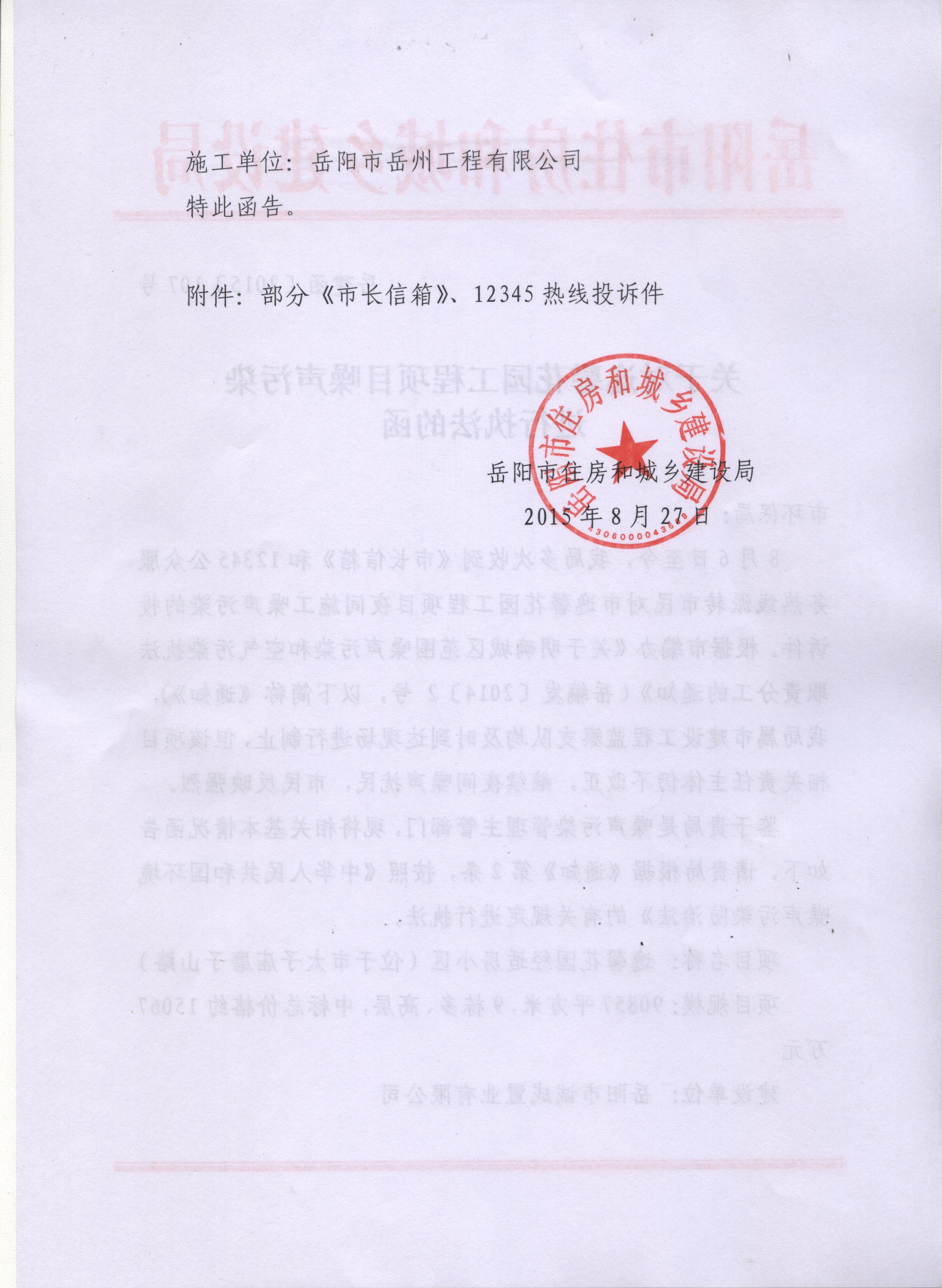 再次回复: | “嬷嬷小生”同志: 经市建设工程监察支队巡查,该工地近半月来没有再发生通宵施工行为,同时,对夜晚10:00-12:00期间的施工行为进行了制止。通过核实和约谈,该工程关键结构必须连续作业的部位已经完毕,项目负责人已承诺夜间施工不超过10:00。若再次发生超时间施工,市建设工程监察支队将联系环保部门进行噪声检测认定,若超标,则由环保部门依法进行处罚。 特此回复。 岳阳市住房和城乡建设局 2015年9月11日 |