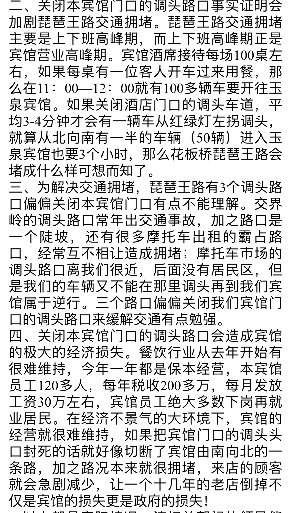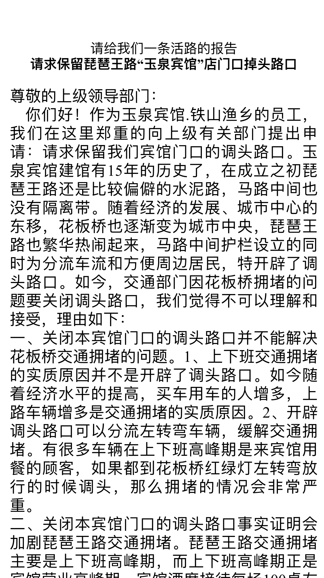 内容: | 请给我们一条活路的报告 请求保留琵琶王路“玉泉宾馆”店门口掉头路口 尊敬的上级领导部门: 你们好!作为玉泉宾馆.铁山渔乡的员工,我们在这里郑重的向上级有关部门提出申请:请求保留我们宾馆门口的调头路口。玉泉宾馆建馆有15年的历史了,在成立之初琵琶王路还是比较偏僻的水泥路,马路中间也没有隔离带。随着经济的发展、城市中心的东移,花板桥也逐渐变为城市中央,琵琶王路也繁华热闹起来,马路中间护栏设立的同时为分流车流和方便周边居民,特开辟了调头路口。如今,交通部门因花板桥拥堵的问题要关闭调头路口,我们觉得不可以理解和接受,理由如下: 一、关闭本宾馆门口的调头路口并不能解决花板桥交通拥堵的问题。1、上下班交通拥堵的实质原因并不是开辟了调头路口。如今随着经济水平的提高,买车用车的人增多,上路车辆增多是交通拥堵的实质原因。2、开辟调头路口可以分流左转弯车辆,缓解交通拥堵。有很多车辆在上下班高峰期是来宾馆用餐的顾客,如果都到花板桥红绿灯左转弯放行的时候调头,那么拥堵的情况会非常严重。 二、关闭本宾馆门口的调头路口事实证明会加剧琵琶王路交通拥堵。琵琶王路交通拥堵主要是上下班高峰期,而上下班高峰期正是宾馆营业高峰期。宾馆酒席接待每场100桌左右,如果每桌有一位客人开车过来用餐,那么在11:00—12:00就有100多辆车要开往玉泉宾馆。如果关闭酒店门口的调头车道,平均3-4分钟才会有一辆车从红绿灯左拐调头,就算从北向南有一半的车辆(50辆)进入玉泉宾馆也要3个小时,那么花板桥琵琶王路会堵成什么样可想而知了。 三、为解决交通拥堵,琵琶王路有3个调头路口偏偏关闭本宾馆门口有点不能理解。交界岭的调头路口常年出交通事故,加之路口是一个陡坡,还有很多摩托车出租的霸占路口,经常互不相让造成拥堵;摩托车市场的调头路口离我们很近,后面没有居民区,但是我们的车辆又不能在那里调头再到我们宾馆属于逆行。三个路口偏偏关闭我们宾馆门口的调头路口来缓解交通有点勉强。 四、关闭本宾馆门口的调头路口会造成宾馆的极大的经济损失。餐饮行业从去年开始有很难维持,今年一年都是保本经营,本宾馆员工120多人,每年税收200多万,每月发放工资30万左右,宾馆员工绝大多数下岗再就业居民。在经济不景气的大环境下,宾馆的经营就很难维持,如果把宾馆门口的调头头口封死的话就好像切断了宾馆由南向北的一条路,加之路况本来就很拥堵,来店的顾客就会急剧减少,让一个十几年的老店倒掉不仅是宾馆的损失更是政府的损失! 以上都是实际情况,请相关部门的领导能够实地考察,听取民意,保留琵琶王路“玉泉宾馆”店门口掉头路口,不胜感激! 玉泉宾馆全体员工 2015-12-1 附:全体员工签名 请给我们一条活路的报告 请求保留琵琶王路“玉泉宾馆”店门口掉头路口 玉泉宾馆全体员工签名: