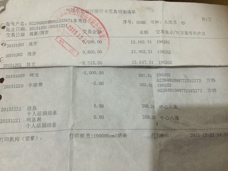 误汇钱给湖南省平江县木金乡保全村7号“方略” 亲爱的岳阳市市长大人: 您好! 初次见面,我是浙江省缙云县人朱秀玲,联系电话18358955513,现居住浙江省金华市永康市古山镇四村工业区下谢山39号,在永康打工。2015年12月20日15点37分,我在永康古山的“中国农业银行”打款,本想将5000块钱汇给一个朋友,因银行的ATM机功能有误,误将5000块钱打到了另一个帐号(62284810987723****2,中国农业银行,方略)(我自己帐号:62284803889622****1,中国农业银行,朱秀玲),经与农业银行协商,银行只肯给个电话,而方略联系电话是空号。经过我自己多方联系,最终了解到误打款对方名叫“方略”,身份证号码是43062619****94215,家庭地址是湖南省平江县木金乡保全村7号,现无法联系到方略本人,所以请市长大人帮帮忙,联系到方略本人或者家里人,要回我自己两个月的血汗钱。 感谢市长大人百忙之中抽空帮忙解决!万分感谢! 附件:打款凭条、交易明细清单。 |