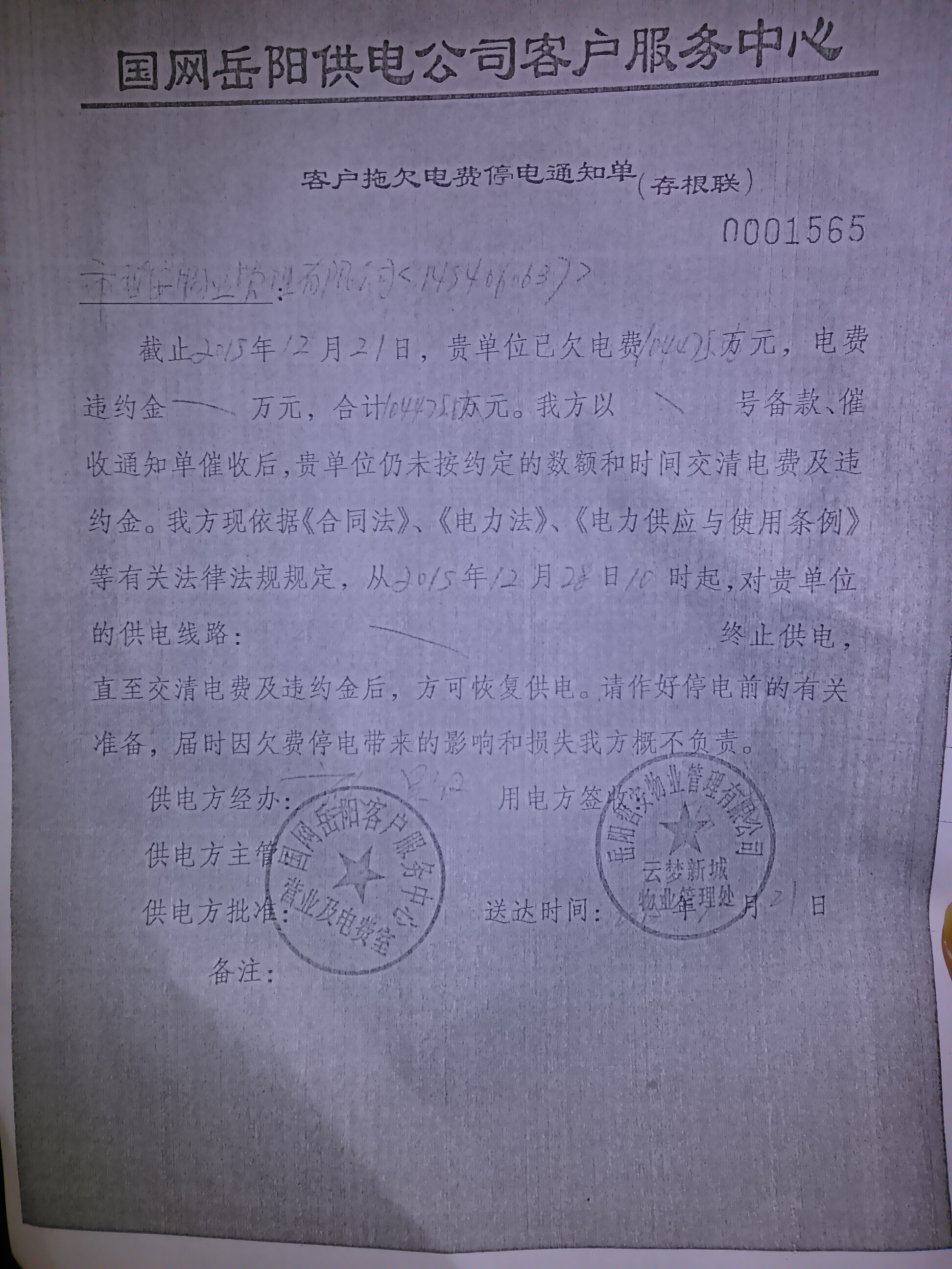 内容: | 自2015年12月28日早10点开始,岳阳市求索西路云梦新城小区公共用电全面截断,至今无任何恢复供电迹象。目前小区公共路段全无亮,夜间全小区漆黑一片,成了岳阳西边的一坨黑斑,不仅影响小区居民夜间活动同时也给小区的管理治安留下相当的隐患。更严重的,本小区由17栋共31楼或18楼楼层的楼宇构成,由于公共用电的中断,高层水泵全部停止工作,目前所有楼宇4层以上居民家里全部断水,4层以上居民只能靠向底层邻居家借水维持最基本的生活用水,造成了全小区近千户居民非常糟糕的居家舒适感和极低的幸福度,目前小区内部已经是怨声载道,人心惶惶! 现,本人为云梦新城居民向市长信箱求助,要求国网岳阳供电公司使用合法合理的途径向哲安物业追讨所欠电费,并恢复全小区供电,使群众有水可用!理由如下:1,如附件照片所示,我们可知,拖欠国网岳阳供电公司电费和违约金的单位是岳阳哲安物业管理有限公司,我们支持国网公司以合理合法的途径和手段向哲安物业追讨欠款,但绝不是此种将风险、将压力转嫁给普通百姓的方式!2,小区物业公司拖欠了国网电费,国网岳阳供电公司有权对小区终止供电,然全小区近千户居民没有拖欠自来水公司毫厘,请问国网岳阳供电公司,你凭什么剥夺人民合法的用水权利!3,国网岳阳供电公司使用合法的途径追缴欠费,我们欢迎我们赞成,但是国网,请你有能耐停我们电,你也得有这能耐别影响我们用水啊!! 以上所诉情况真实,诉求亦是云梦新城千户居民的急迫心声,请求市政领导重视并能有效解决我们的燃眉之急。劳市政领导担忧,实无奈之举、万分恳请! |