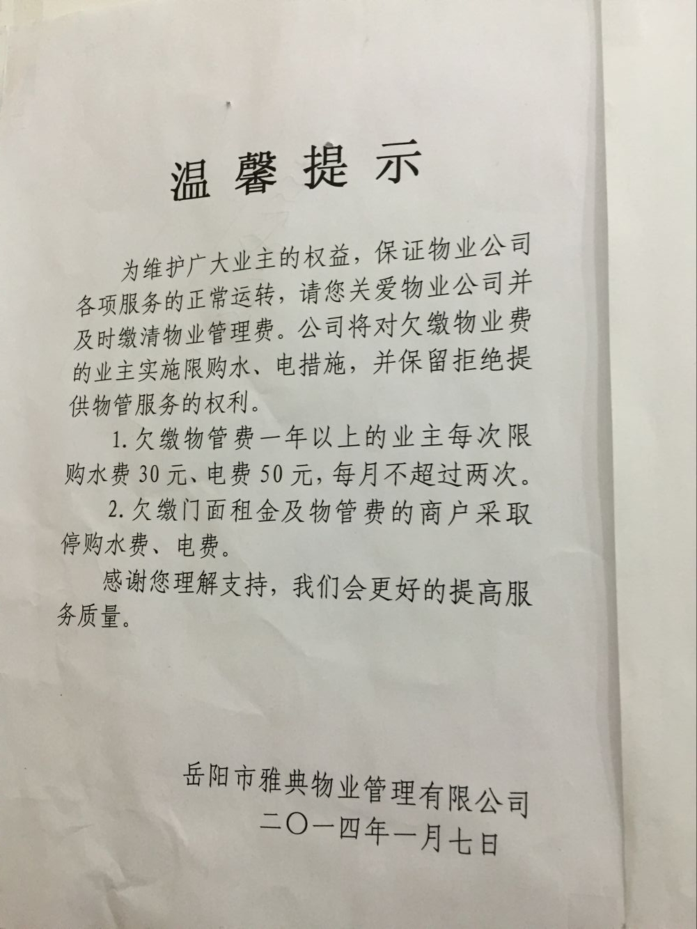 内容: | 我是岳阳楼区雅典新城的业主,14年我家阳台漏水,多次与物业沟通均不作为,自行找人水管试压后均无问题,导致我们家墙面损坏严重,因此拒交14年物业费。我们家自2007年入住雅典新城以来,雅典物业公司(即雅典新城的房地产开发公司岳阳登峰房地产)从未组织广大业主召开业主委员会,却背着我们成立了业主委员会;非法占用业主的空间作为办公用地和私人住宅;擅自拆除更改小区内的建筑诸如篮球场等活动设施;违规招标电梯公司致使我们多用维修基金;提供日常服务质量差,物业费、水电费收费偏高等等,以上行为严重侵犯了业主的合法权益。 鉴于以上,有些业主以拒交物业费维权。2016年初,当我们再去物业公司购买水、电费时,物业公司工作人员以我们欠缴一年物业费为由,限制我们购水购电,只允许我们一次购买30元水电和50元电费,而且一月只准购买一次;对欠缴二年以上无业费的,不允许购买水电费。由于雅典新城的水电费只能到物业公司购买,这一规定严重影响了我们的基本生活权利,将直接导致我们今后无法居住。面对这样一个无视业主权利的“霸道物业公司”,我们广大业主恳求市长作主,还我们一个公道: 1,撤销限购水电费的无理规定; 2,成立新的业主委员会; 3,退还本该属于业主的活动空间; 4.更换物业公司 谢谢! |