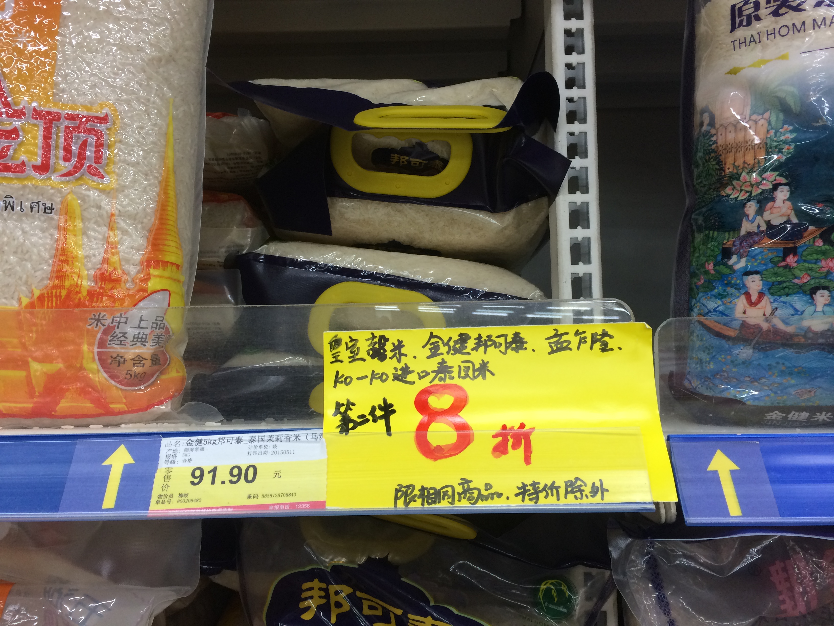内容: | 这家超市的米的货架上有种商品为金健邦可泰大米5KG装,货架上的促销牌说明了邦可泰的大米第二件8折,但是在柜台结账时,第二件未8折,收银员向相关负责人打电话询问,负责人也反复询问了是不是邦可泰。但是不知什么原因,最后收银员的回复是打8折的商品已断货,货架上的邦可泰乌汶府大米没有第二件8折,是另外一种叫金泰的大米才有优惠。
