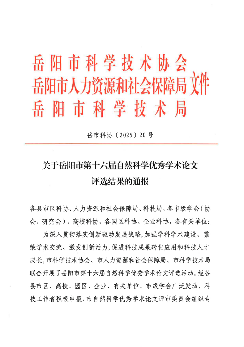 关于岳阳市第十六届自然科学优秀学术论文评选结果的通报