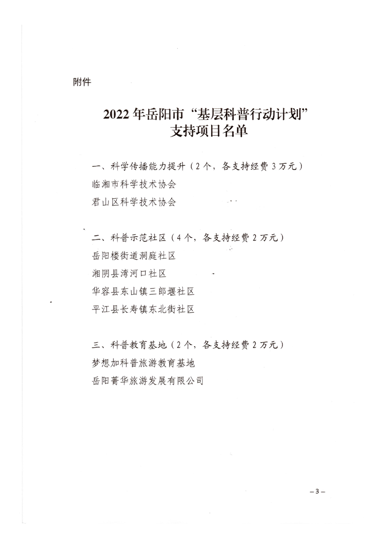 关于公布2022年岳阳市“基层科普行动计划”支持项目的通知