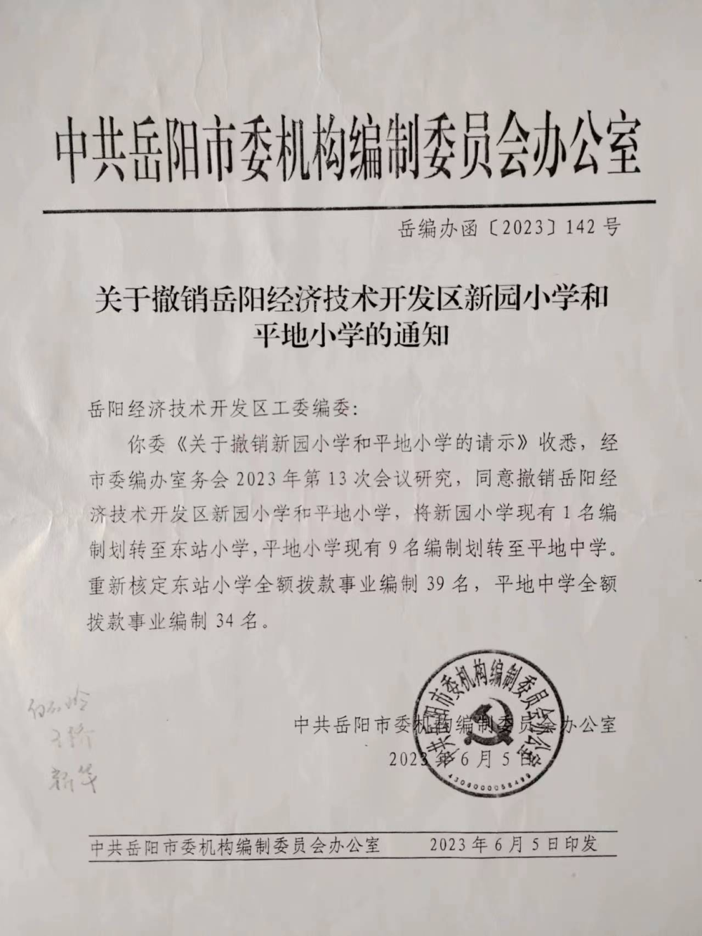 关于撤销岳阳经济技术开发区新园小学和平地小学的通知