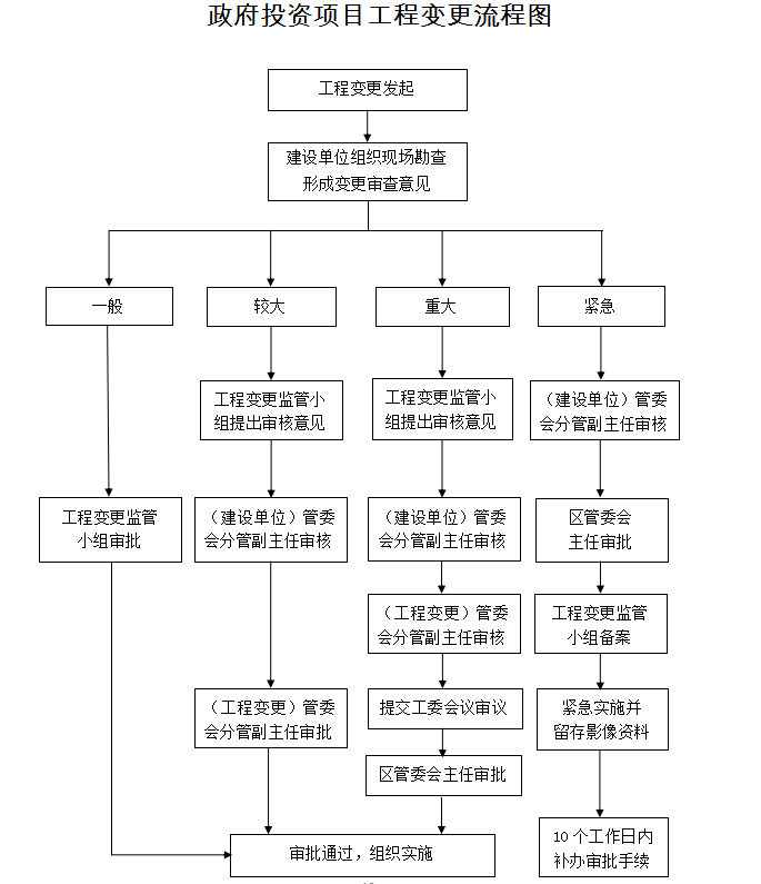 第十五条 如出现危及生命及财产安全的紧急情况,为保证生命和工程安全,建设单位在管委会分管副主任审核、管委会主任审批同意及向工程变更监管小组备案后,可会同施工单位采取抢险和控制局面的必要措施并留存相关影像资料,并在下达变更指令后10个工作日内按第十二条规定程序补办变更审批手续。