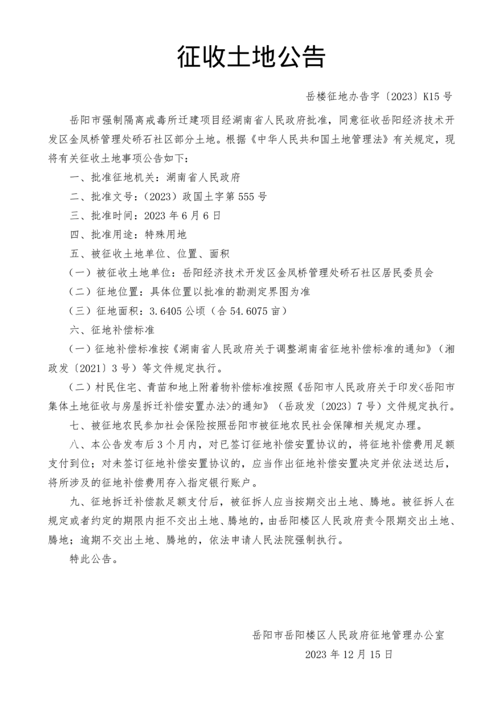 征收土地公告(强制戒毒所迁建)