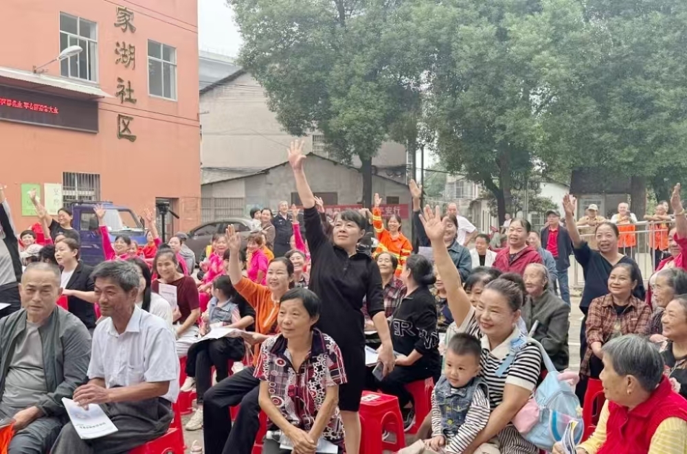 宣讲会开始,岳阳楼街道志愿者和谐宣讲团团长徐湘平以《五次受阅 一生荣耀》为题,为大家宣讲了“抗战胜利80周年阅兵”军事航天方阵教练员、平江伢子邹汪平五次参加阅兵的故事,“阅兵,究竟阅的是什么?”“阅的是国威军威,阅的是和平尊严。而支撑这一切的,是千千万万个像邹汪平这样的战士所代表的忠诚、奉献、极致、坚持的精神!”徐湘平用平实生动的语言讲述阅兵训练的辛苦和严格,分享阅兵中的精神传承。赢得观众席上邻里居民的阵阵掌声。宣讲结束后,居民们组织表演了《我的祖国》《让胜利的红旗高高飘扬》等精彩的歌舞节目。