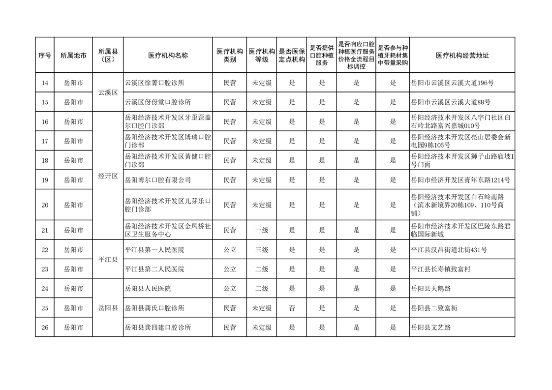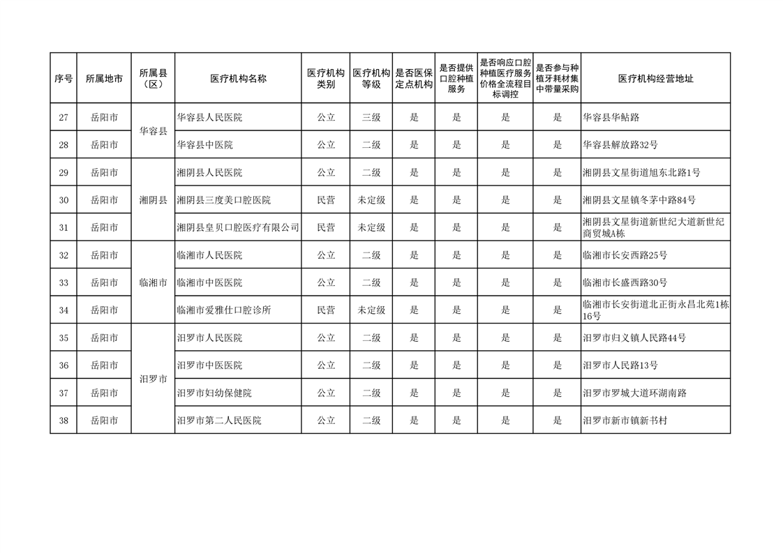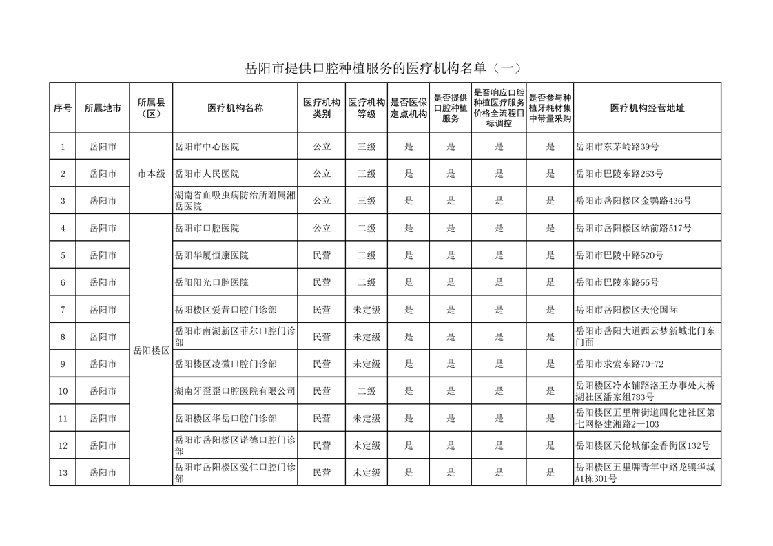 为切实减轻群众种植牙负担、促进种植牙行业健康可持续发展,保障口腔种植医疗质量稳步提升,按照《国家医疗保障局关于开展口腔种植医疗服务收费和耗材价格专项治理的通知》(医保发〔2022〕27号)、《国家医疗保障局关于开展口腔种植体集中带量采购工作的预通知》(医保价采函〔2022〕125号)要求和省医保局相关工作部署,现将岳阳市开展口腔种植服务医疗机构,响应国家组织口腔种植体集中带量采购和口腔种植医疗服务价格全流程目标调控相关情况予以公示,供广大群众参考。
