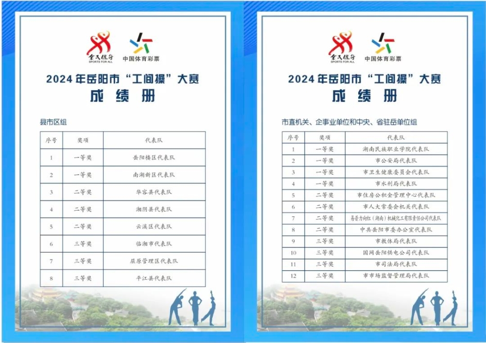 评委们从团队精神面貌、整体动作节奏等多个方面对各代表队进行客观全面的评价,经过一天的激烈比拼,最终,岳阳楼区、南湖新区代表队荣获县市区组一等奖,湖南民族职业学院、市公安局、市卫生健康委员会、市水利局代表队荣获市直机关、企事业单位和中央、省驻岳单位组一等奖。在广播体操韵律声中,彰显出强大的团队协作力量。