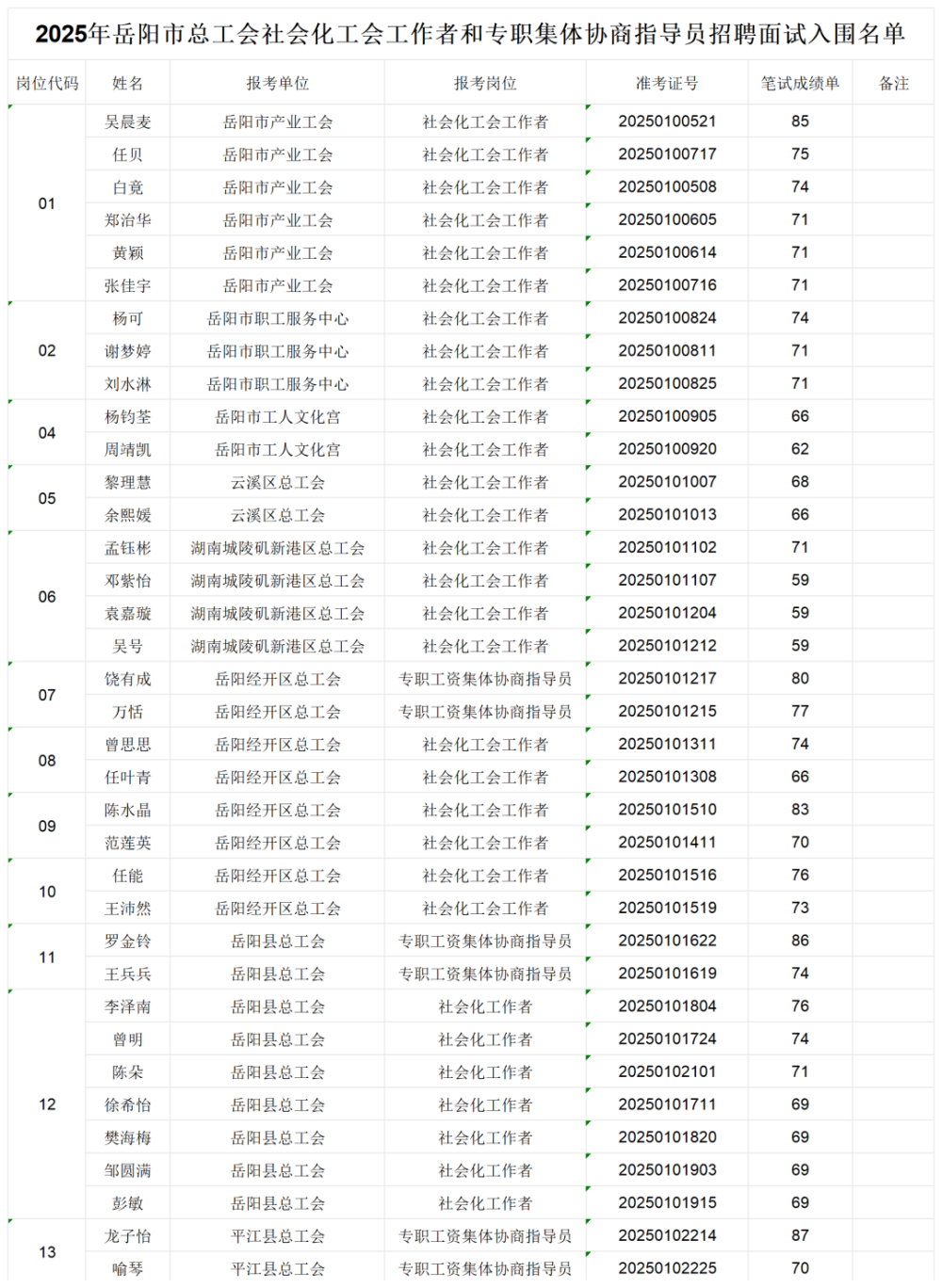2025年岳阳市总工会社会化工会工作者和专职集体协商指导员招聘笔试成绩及面试入围人员名单
