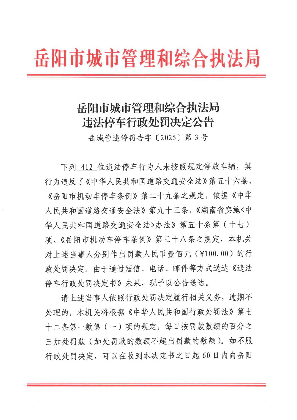 岳阳市城市管理和综合执法局违法停车行政处罚决定公告(岳城管违停罚告字[2025]第3号)